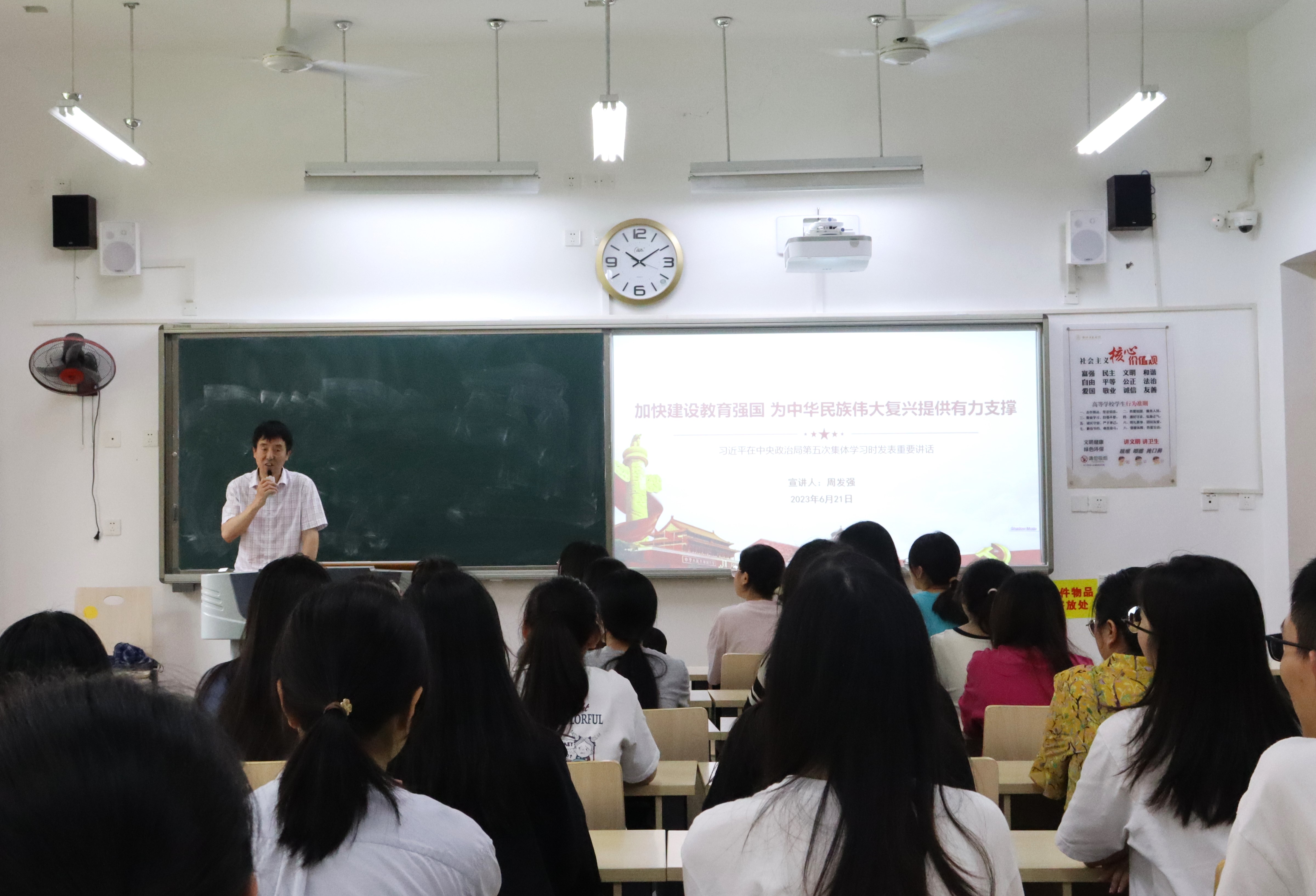 6月20日上午10点,我校党办、院办主任周发强老师在明德楼B区107教室为联系班级开展了以“加快建设教育强国,为中华民族伟大复兴提供有力支撑”为主题的专题讲座。本次活动由我院学工办辅导员汤靓老师担任主持人,我院2021级6班全体同学共同参与。