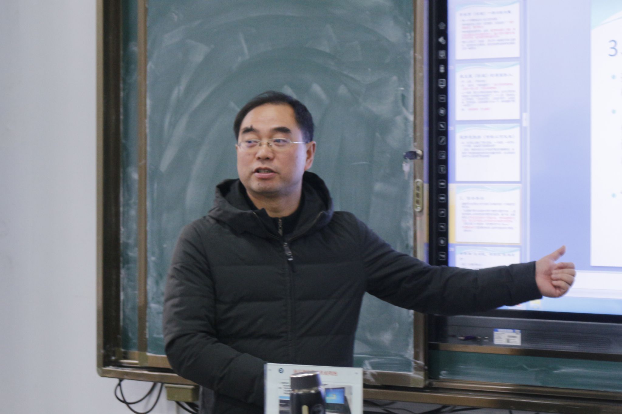 随后于教授为学员们展示了高效课堂在课堂实践和理论知识方面的改革成果,提出高效课堂的重要性。紧接着,他从学案导学、展示当家、合作互教、教学翻转四个方面讲解了高效课堂的主要教学策略,并通过举例证明策略的正确性和必要性。同时他还提出了高效课堂要注意避免的几个极端化倾向,告诫学员们在教学过程中要避免教学学习化、效果知识化、课堂程式化、教师观众化。