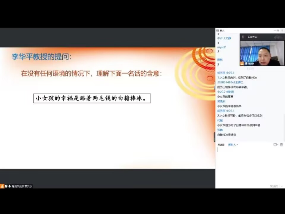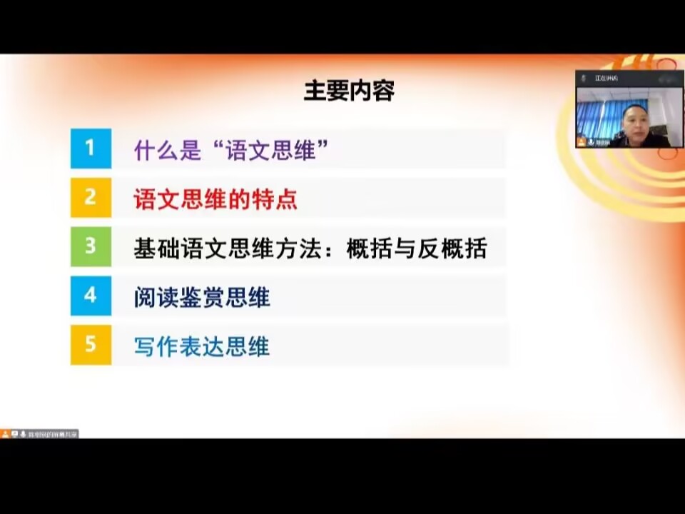 讲座伊始,陈老师以什么是思维、什么是语文等问题为切入点,循序渐进地为同学们讲述了语文思维,并从语文思维的定义、本质等方面对其进行深入剖析。随后,陈老师带领大家学习语文思维的特点,并表示语文思维作为学科思维的下位概念,探索其与数学思维、科学思维等其它学科思维不同的一些基本特点更有利于对语文思维方法体系的探索和坚持思维的科学性。紧接着,在“基础语文思维方法:概括与反概括”板块陈老师为大家展示了概括思维的操作步骤,讲解了概括思维与反概括思维的具体含义,并将两种思维进行了对比,强调了概括思维的重要性。最后,陈老师借用幻灯片,向同学们阐述了阅读鉴赏思维和写作表达思维的相关问题。在讲座结束后,陈剑泉老师与同学们进行了线上互动交流。