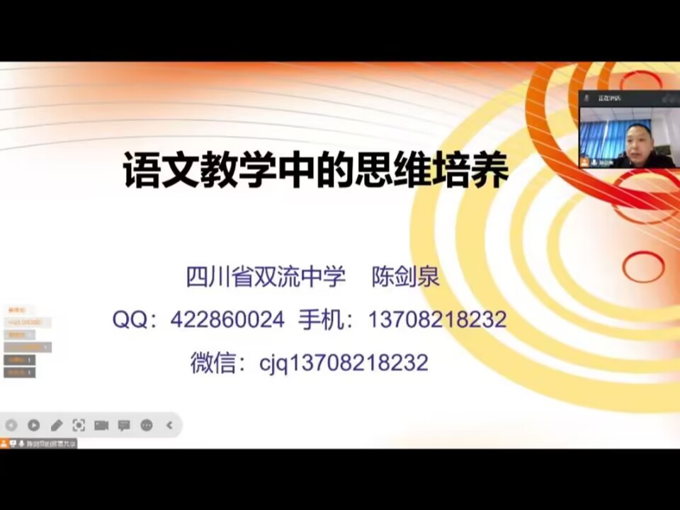 11月12日下午2点30分,我院精心筹备的“语文名师大讲堂”系列学术讲座正式拉开帷幕。首场讲座腾讯会议线上举行,由四川省双流中学正高级语文教师陈剑泉主讲,讲座主题为“语文教学中的思维培养”。我院汉语言文学专业2019级师范班130名同学聆听讲座。学院领导周艺、梁明玉及文学院部分老师参与讲座。讲座由梁明玉院长主持。