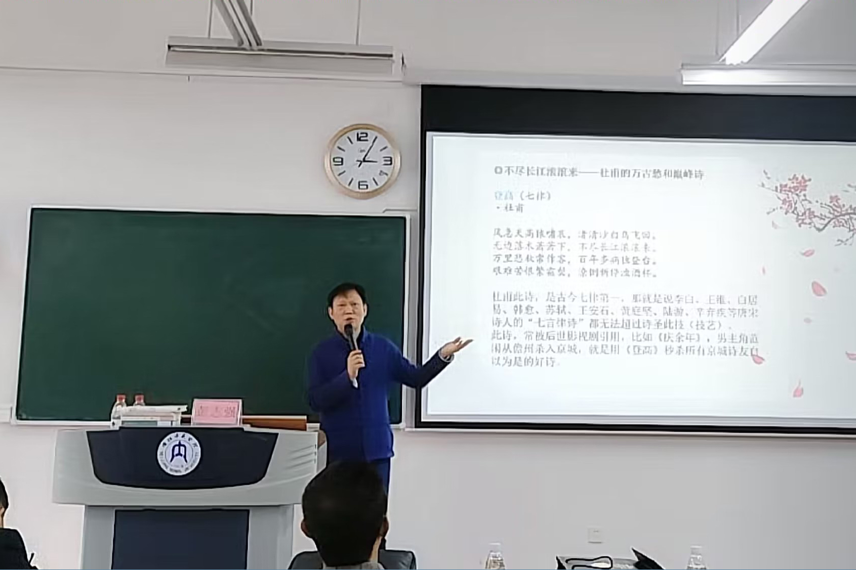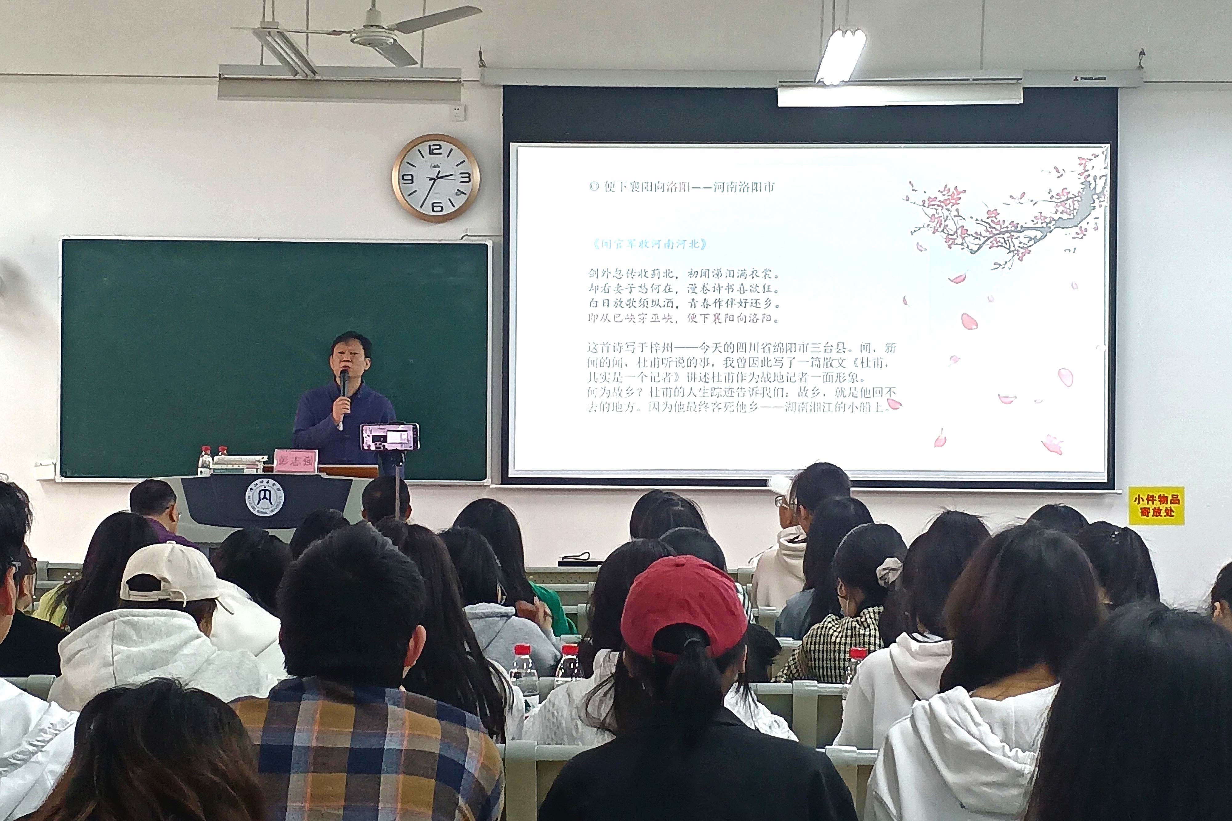 从彭教授的叙述里,我们看见了以诗为史、首首哀歌如泣如诉、镌刻人间疾苦的杜甫;看到用诗歌表达和记录内心喜悦和希望的杜甫;窥见以诗明志、次次推敲倾注心血、映照胸襟气度的杜甫。这加深了同学们对于杜甫,对于诗歌的深切理解,也为之后的学习生活提供了指示与方法。