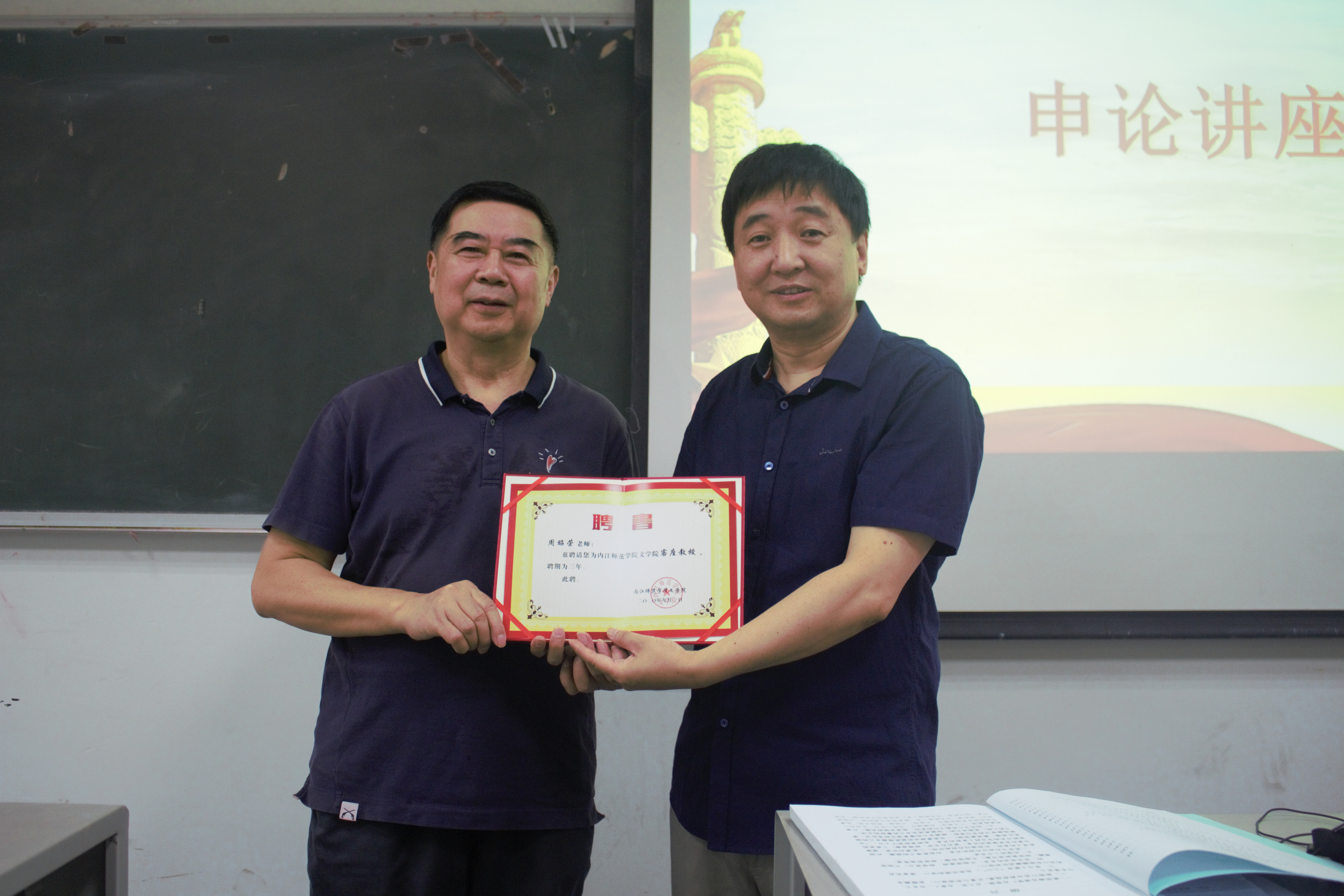 9月9日上午9点30分,我院在中文楼203教室举行周昭荣老师申论讲座暨客座教授聘任仪式。兹聘请内江大千流动讲堂讲师周昭荣为我院客座教授, 我院2018级部分同学参与。此次仪式由院长刘云生主持。