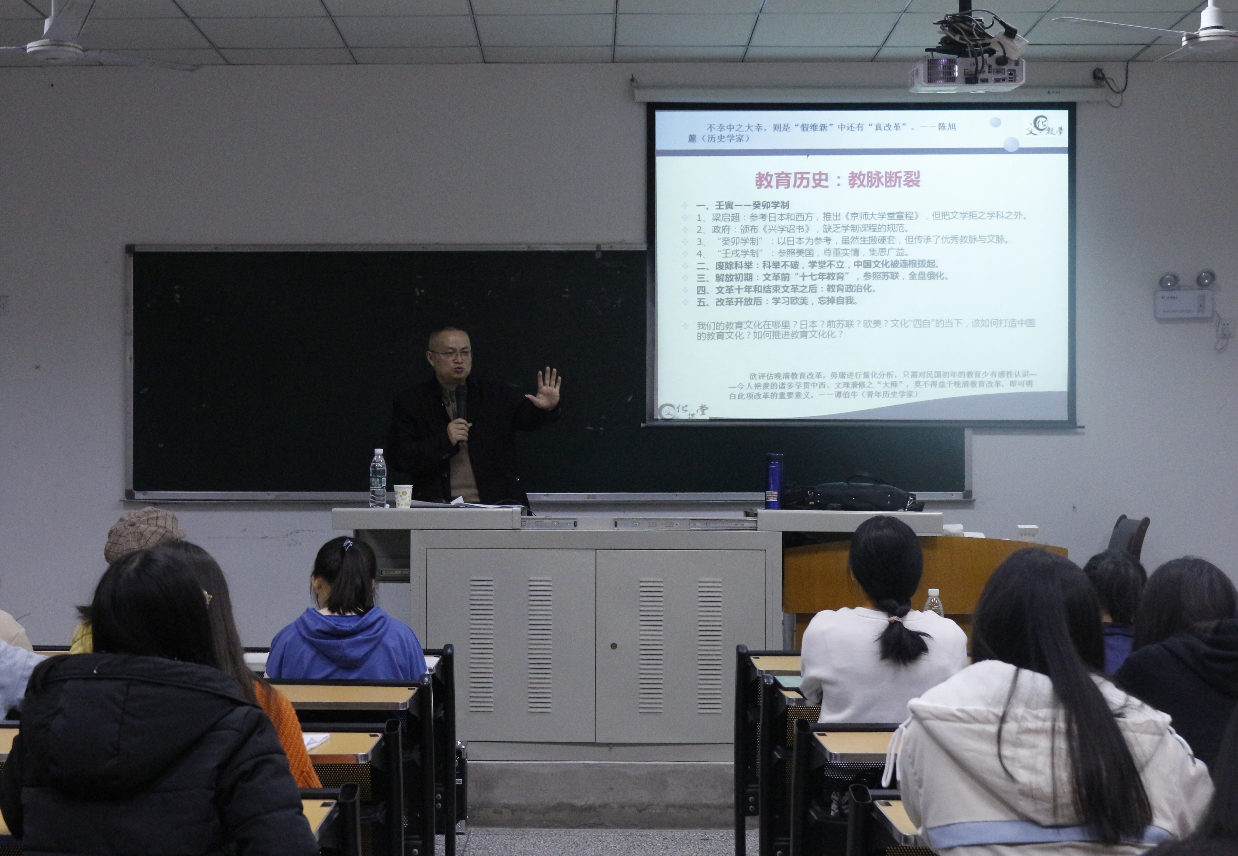讲座伊始,谭衡君老师从为什么要提倡文化教学、什么是文化教学、怎样实施文化教学、全国文化教学大赛的课堂实践这四个方面对文化教学进行了初步的讲解。其中,他指出,文化教学在人类发展史上起着极为重要的作用,当代教师要学会把文化教学带进课堂,以文化的方式传递文化。紧接着,针对世界语境下的文明范式,谭老师表示,世界各国的文化始终处于不断碰撞融合的状态,国家要想实现文化复兴,当代青年就要承担起自己的历史使命,不断推进文化的全面发展。随后,谭老师围绕文化内容的传递、文化精神的培养、文化人格的塑造三个方面对文化教学的性质作出了系统地讲解。其中,他强调,如何正确定义并进行文化教学在传承文明的过程中显得十分重要。最后,谭老师提醒同学们,课堂应具有一定的文化内涵、人文情怀和文化思辨,以实现素质教育与应试教育相结合的课堂模式。