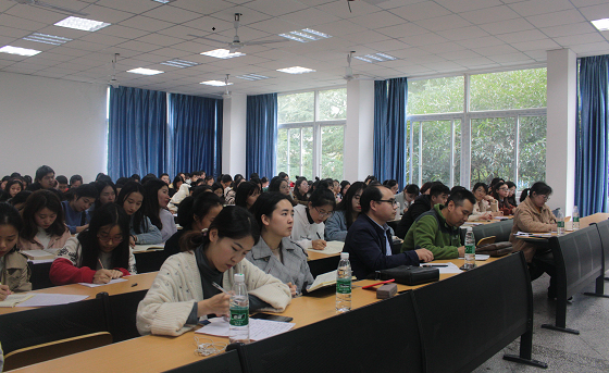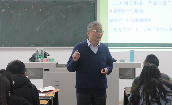 王教授从“影响文本解读五个因素”展开了讲解,在讲解“作者文本”不一定是教学文本时,王教授用家喻户晓的文章“两小儿辩日”举例,他指出在“两小儿辩日”这一文章中作者列子的意图是对儒家的讽刺,而在教学文本中所反映的则是孔子老实本分的品质。王教授将空洞的理论与实际案例相结合帮助同学们更好的理解。随后,王教授在现场背诵《岳阳楼记》向同学们展示了言语积累的重要性,他希望同学们加强言语积累扎实稳固语言基础。王教授深入浅出解释了文本解读的三个维度,以其渊博的知识、精辟独到的见解、生动不失严谨的语言激发了在场学生的学习热情。