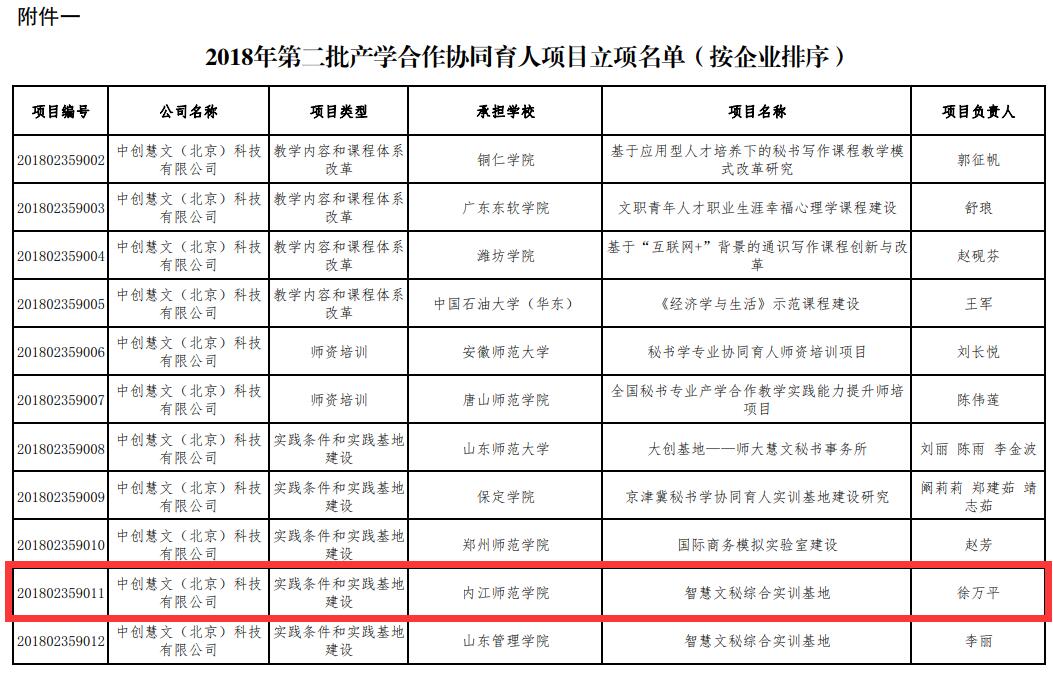 近日,教育部高教司公布“有关企业支持的2018年第二批产学合作协同育人项目”立项名单,我院徐万平副教授领衔的团队项目“智慧文秘综合实训基地”经过层层遴选成功立项。项目编号为:201802359011,立项类别为“实践条件和实践基地建设”。