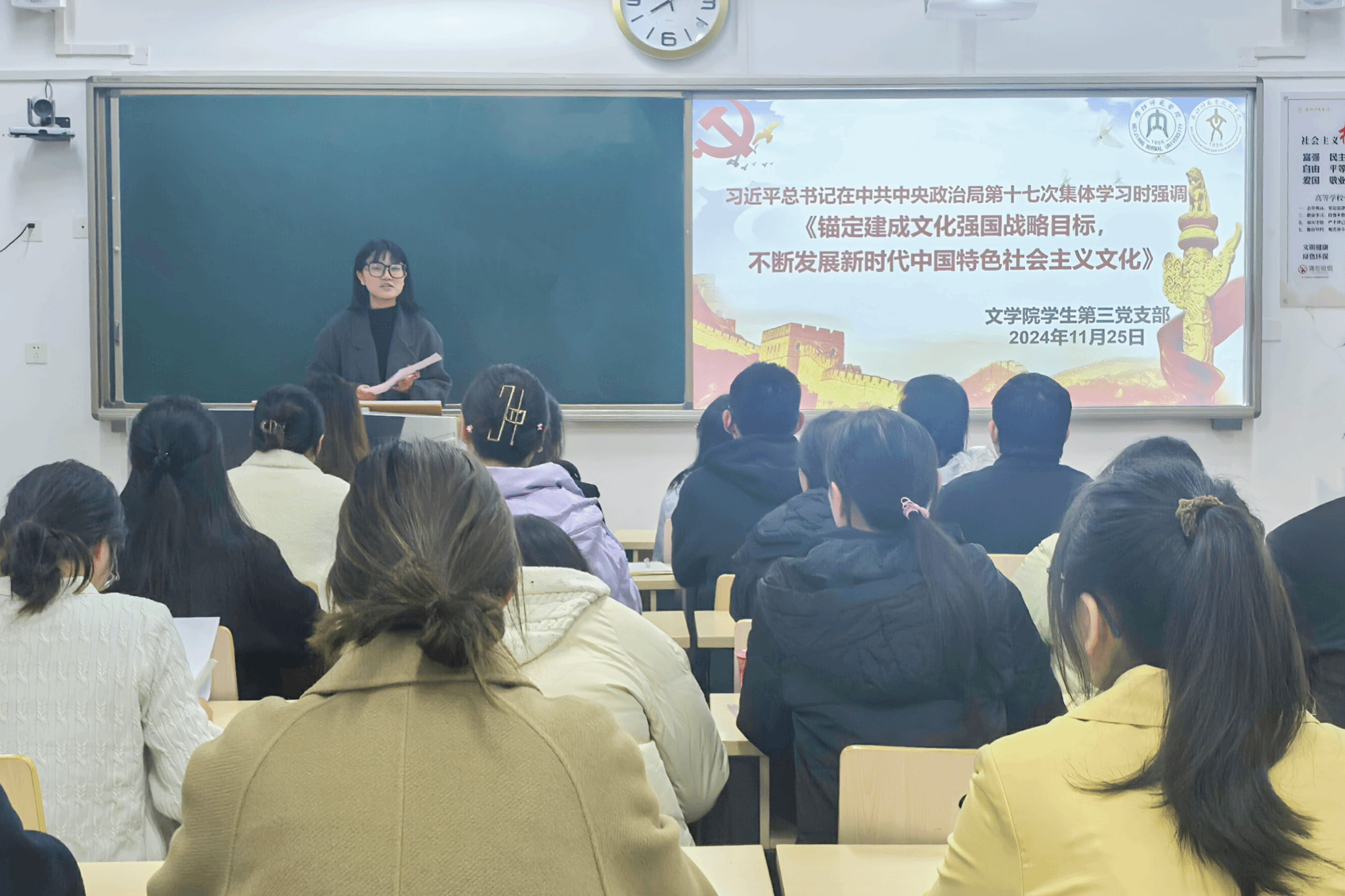 支部书记雷业详细解读了会议“锚定建成文化强国目标,不断发展新时代中国特色社会主义文化”的重要指示精神,阐述了文化强国战略目标的重大意义,强调了文化建设在党和国家发展全局中的重要地位。