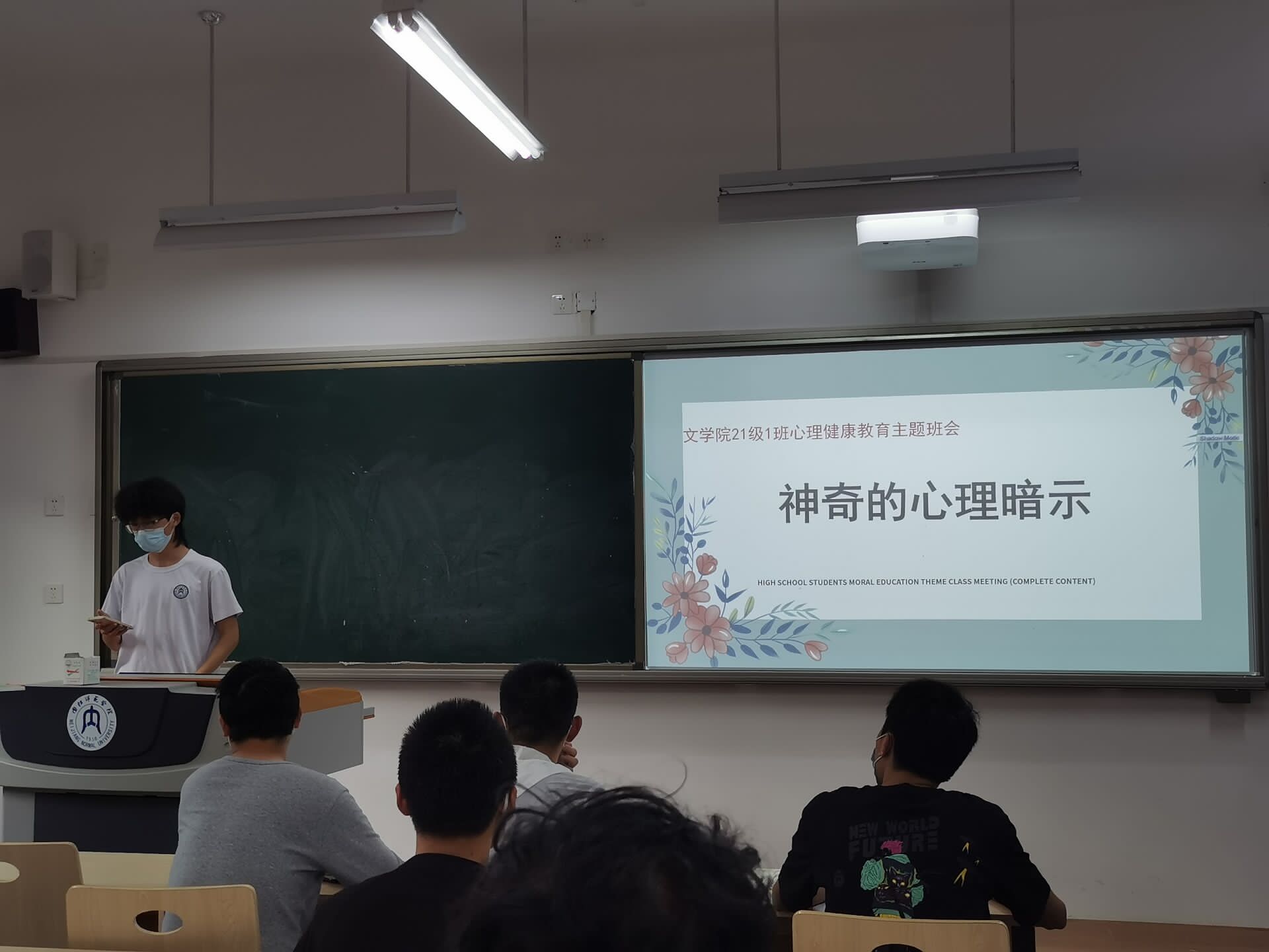 班会伊始,陈老师通过播放视频向同学们介绍了学生常见心理问题、心理健康判断标准、心理问题解决方法、人生价值取向导航等心理健康知识,涵盖了多个方面,让同学们对心理健康有了更加深刻的认识。随后,同学们就如何克服学习和生活中出现的心理问题展开了激烈的讨论。在讨论中,陈老师及时为同学们进行心理疏导,并积极引导各位同学朝着阳光健康的方向发展。班会最后,陈老师进行总结,希望同学们通过此次班会,能增强自己克服困难、经受考验、承受挫折的能力,培养良好的心理品质和自尊、自爱、自律、自强的品格,