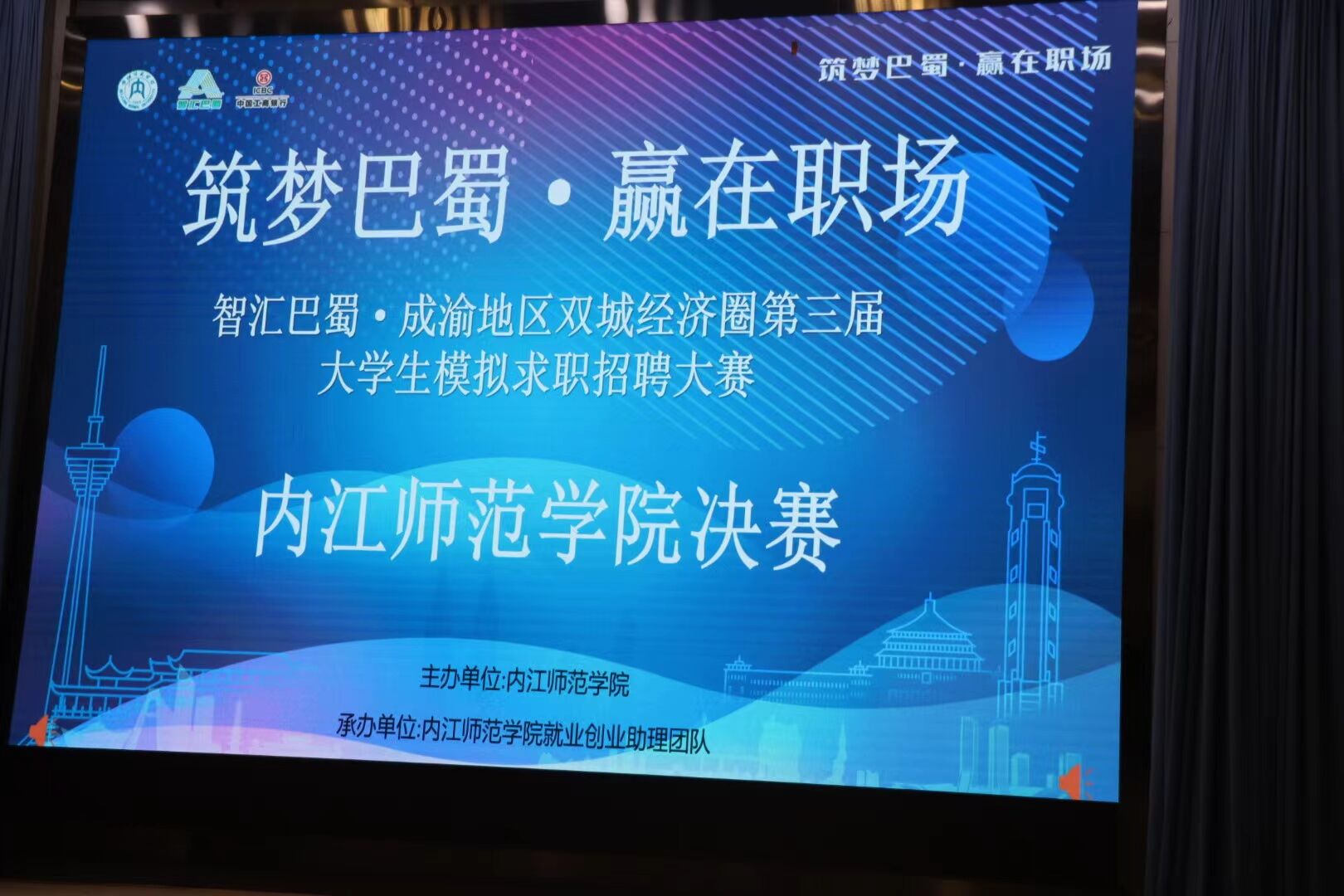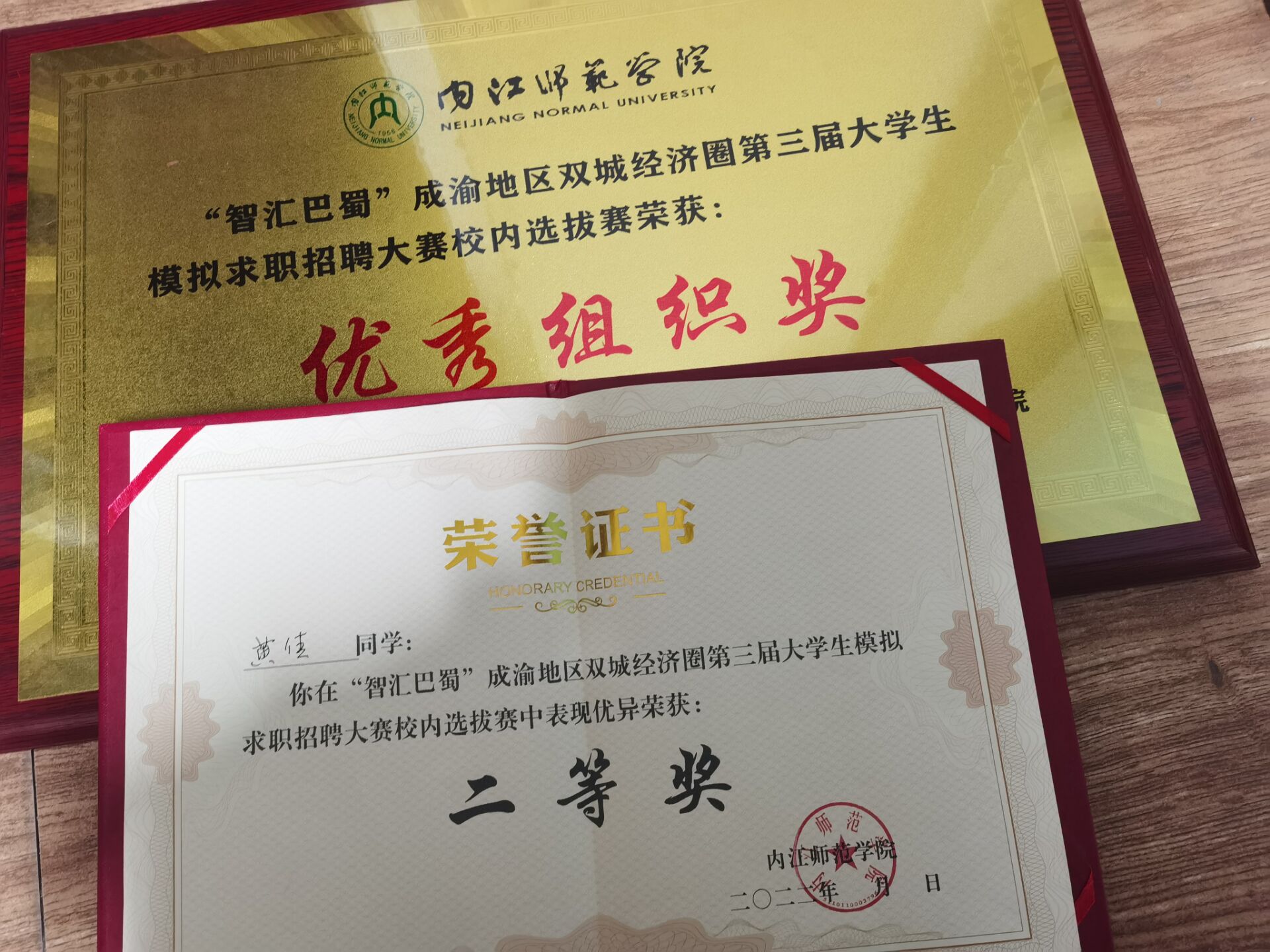 4月28日晚上7点在内江师范学院桐梓坝校区第一学术报告厅举办了智汇巴蜀·成渝地区双城经济圈第三届大学生模拟求职大赛校内选拔赛。我院2019级4班黄佳同学荣获此次大赛二等奖,我院获得了优秀组织奖。