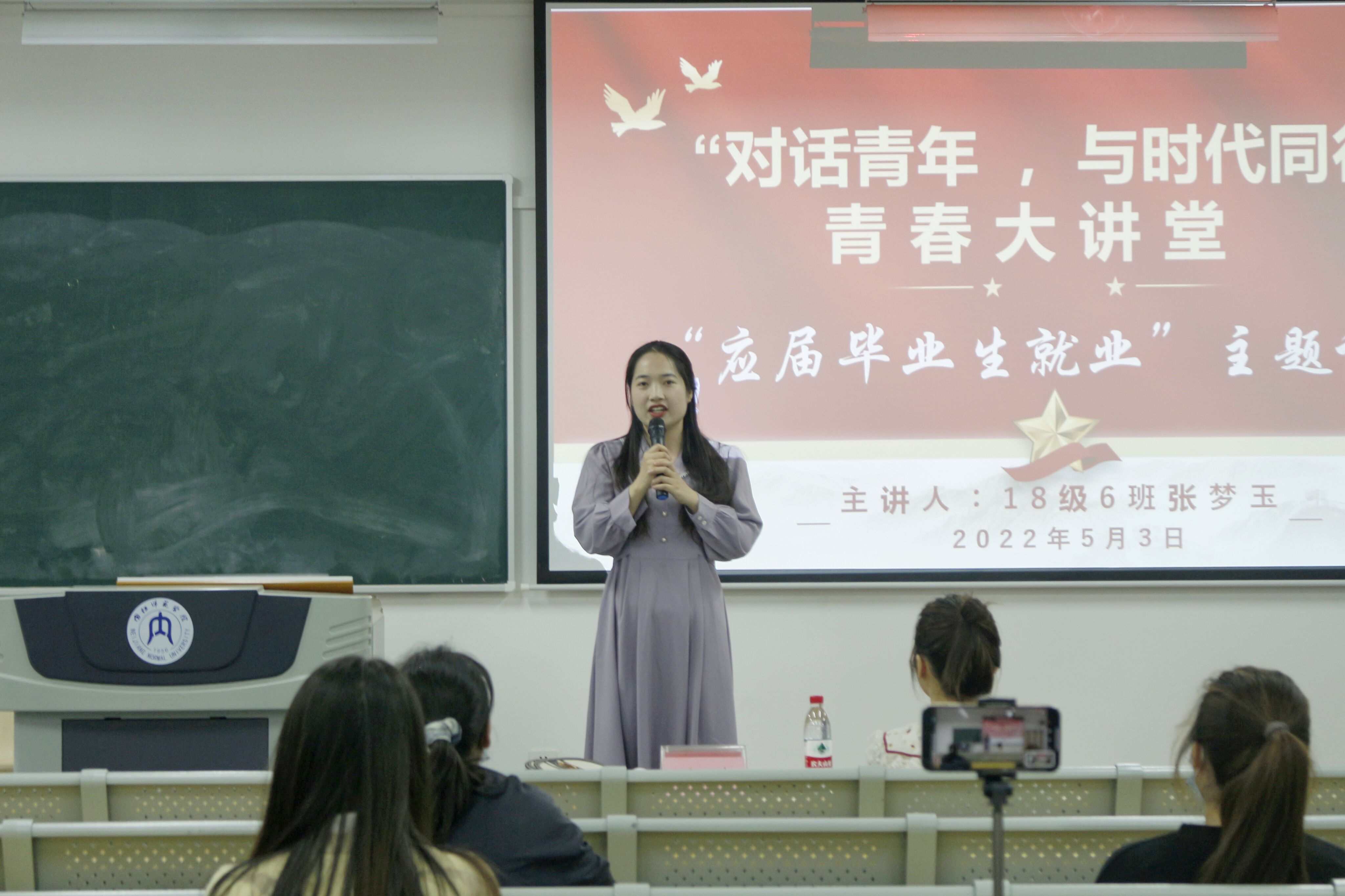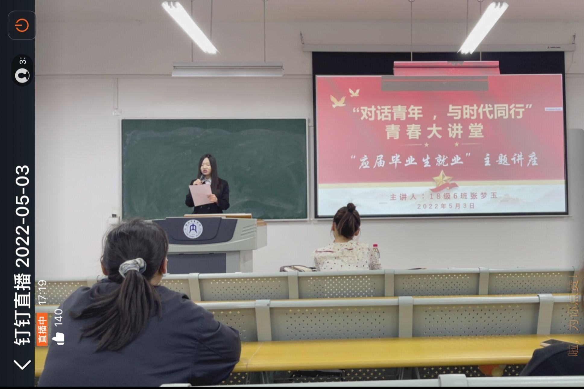 为帮助毕业生明晰就业形势,积极转变就业观念。5月3日晚上7点,我院于明德楼B区201教室开展第二期“对话青年,与时代同行”青春大讲堂——毕业生就业主题讲座,由2018级6班张梦玉同学作为主讲人,主持队韩佩珂担任主持人。此次主题讲座采用“线上线下”相结合的形式举办,我院辅导员汤靓老师,2018级全体同学和2019级部分同学参与了此次讲座。