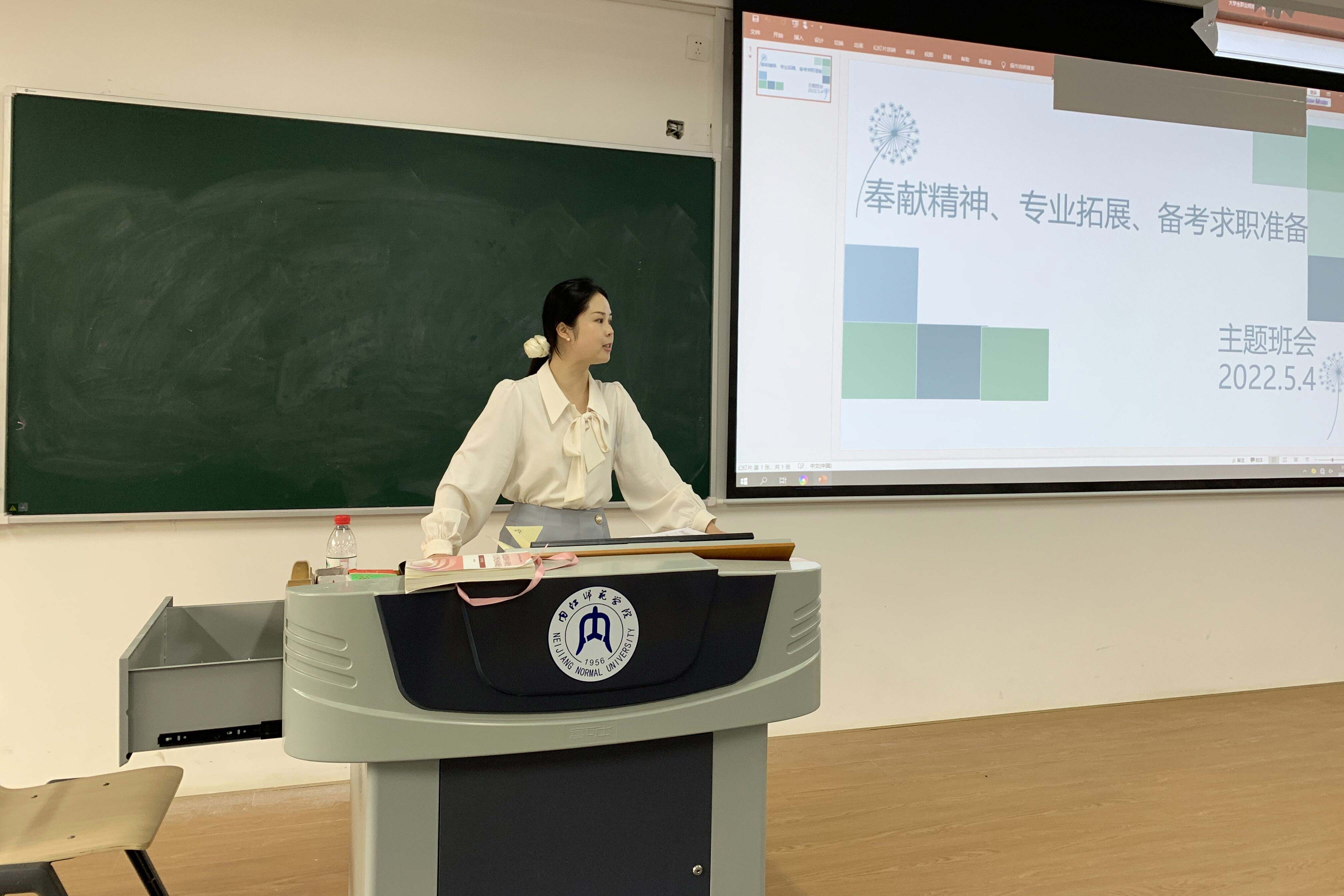 为继承弘扬奉献精神,进一步落实教育部关于做好 2022 届全国普通高校毕业生就业创业工作的通知,推动我院学生就业创业,我院组织开展了以“奉献精神、专业拓展、备考求职”主题班会。其中,我院2019级1班于5月4日晚上7点在明德楼B301教室组织开展了此次主题班会。本次班会由辅导员金夏老师主持,2019级1班全体学生参与。