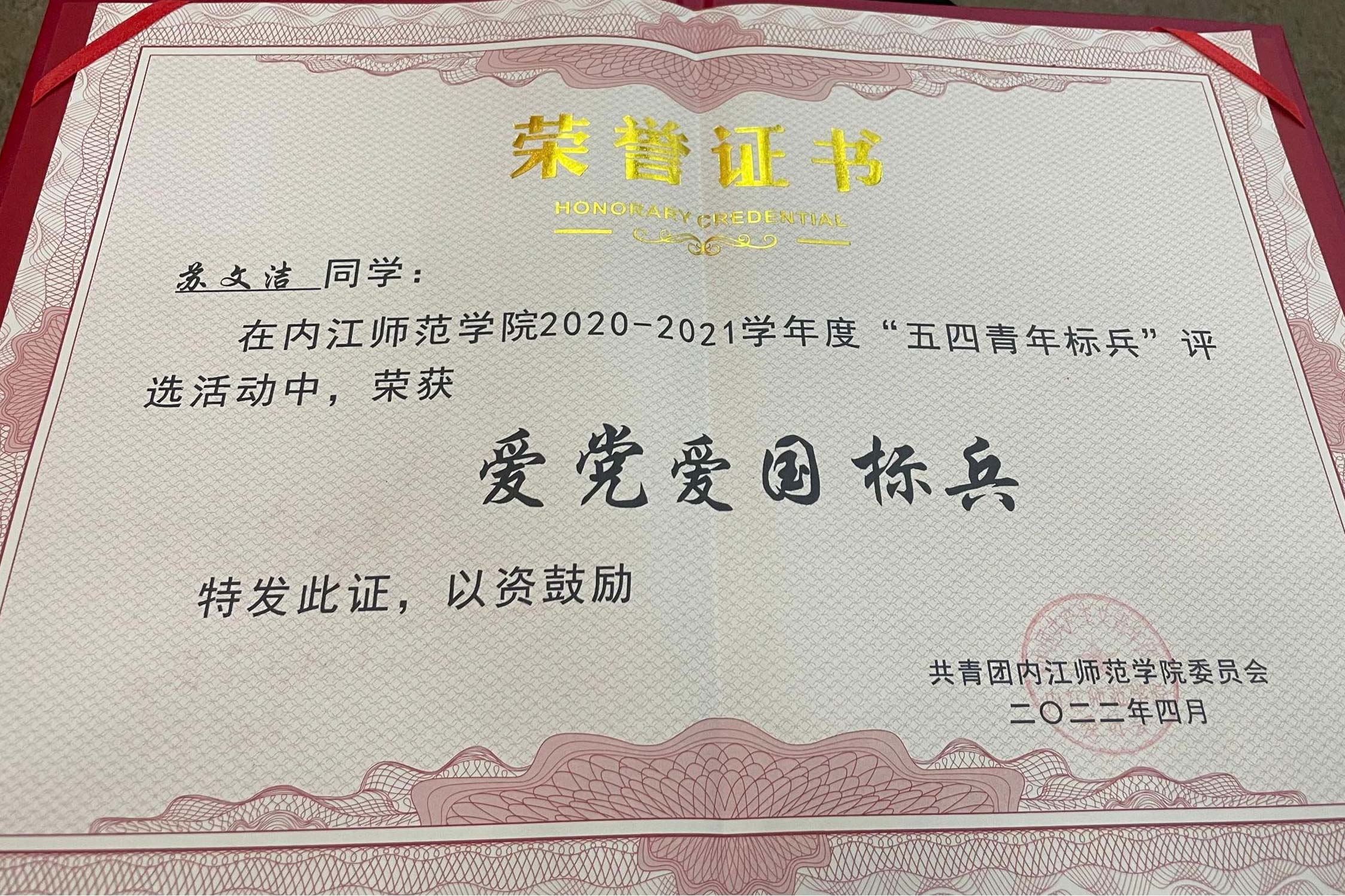 在建团百年到来之际,为充分发挥青年团员模范带头作用,激励广大青少年踔厉奋发、勇毅前进,喜迎党的二十大胜利召开,内江师范学院于5月4日下午2点30分在桐梓坝校区东区礼堂举行了“2022年五四表彰大会”。其中,我院2019级2班苏文洁同学荣获了“爱党爱国标兵”称号。5月9日下午1点,我院对苏文洁同学进行了专访。