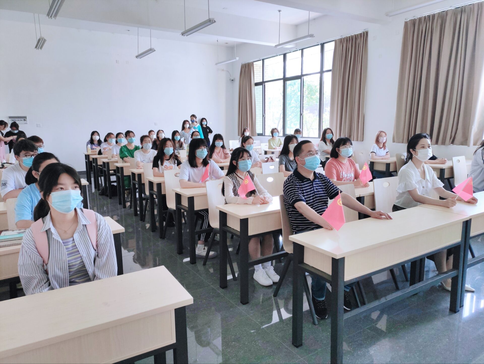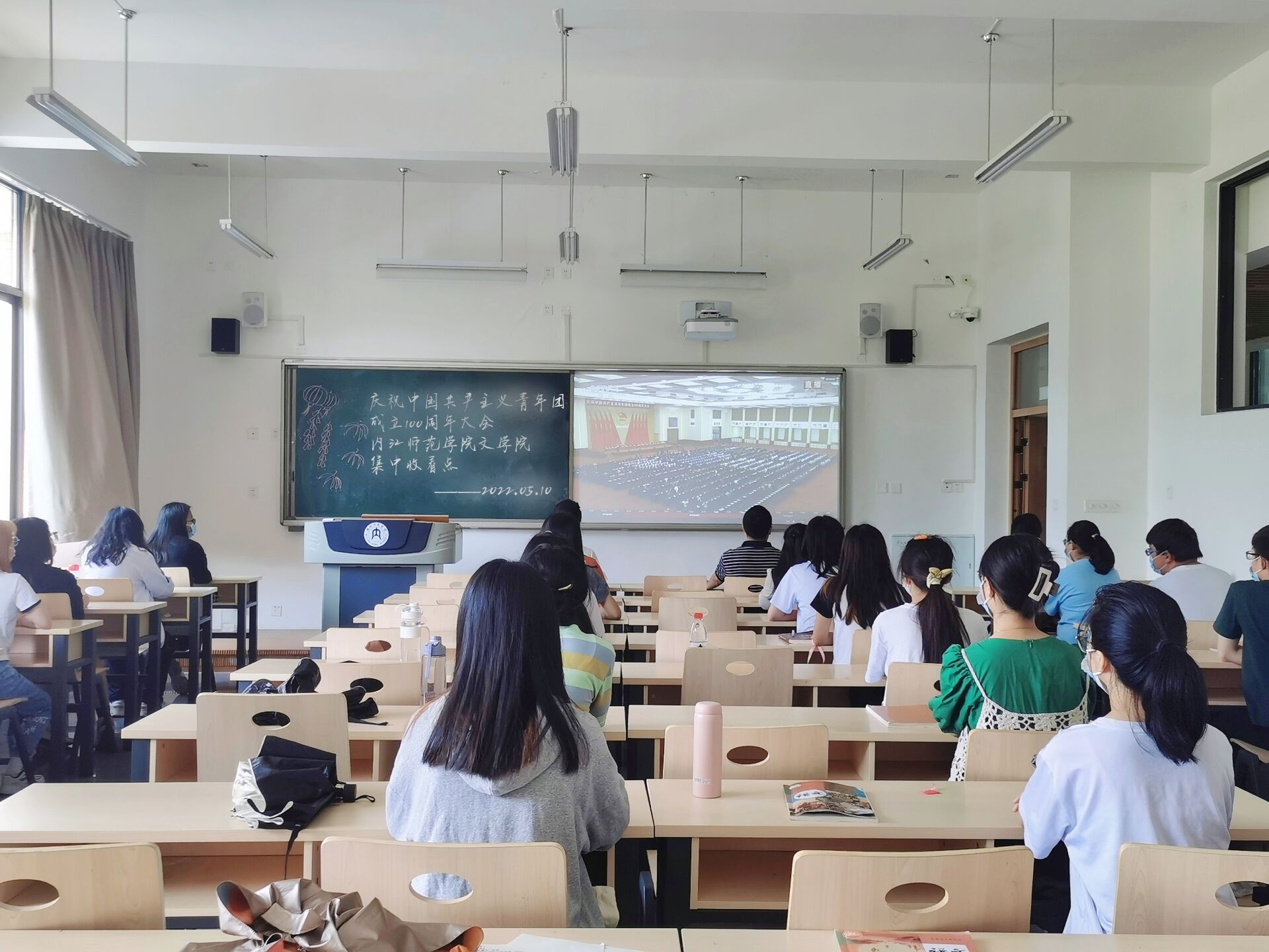 百年征程栉风沐雨,岁月不改青春底色。为庆祝中国共产主义青年团成立100周年,积极引导广大青年大学生勇担时代责任,展现青年担当,5月10号上午10点,我院组织全体同学观看庆祝中国共产主义青年团成立100周年大会直播,其中我院2021级4班于明德楼B区108教室集体观看了此次直播。