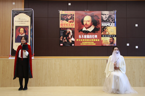 12月12日下午3点,由我院2019级同学组成的“内师文学院莎士比亚环球剧团”在弘文楼103教室成功举办“永不谢幕的经典——莎士比亚戏剧台词朗诵会”。此次演出由我院党总支副书记(主持工作)周艺,副院长(主持工作)梁明玉,党总支副书记刘正丽,副院长于军民担任艺术顾问。王彤老师、金夏老师、王帅龙老师担任艺术指导,胡鹏鹏、周洋洋、陈宣伊、胡学琨同学担任导演。胡学琨、廖朝辉同学担任此次演出主持人,2019级部分学生参与演出。