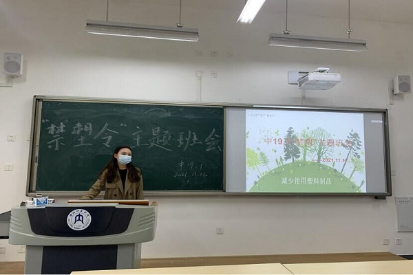 随着人类社会的迅速发展,塑料制品为我们提供了便利,却也带来了长久的危害。为积极响应国家政策,抵制“白色污染”,提高同学们的环保意识,我院安排各班相继开展以“禁止使用不可降解一次性塑料制品”为主题的班会,其中2019级1班于11月12日下午在明德楼B区120教室开展了此次主题班会。