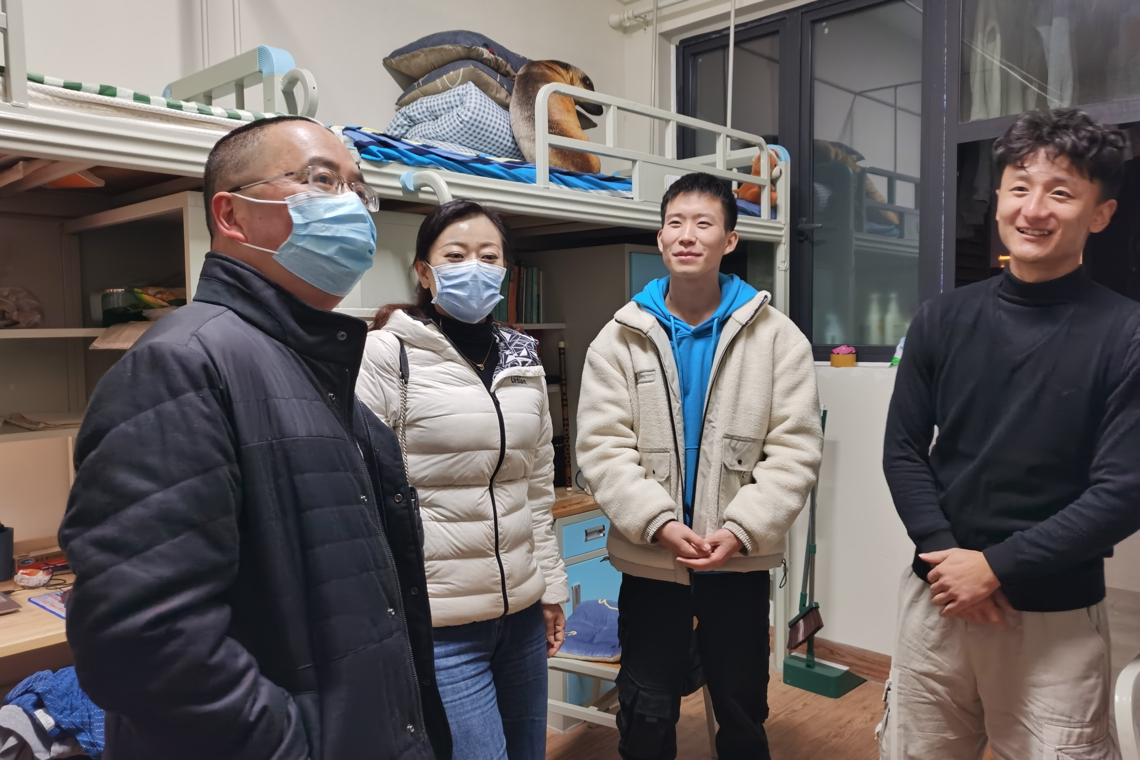 在走访的过程中,老师们亲切地与同学们进行了沟通,并耐心地询问了同学们的衣食住行和学习状态等方面的问题。其中,周书记表示,同学们要充分理解在疫情防控期间,学校所采取的“非必要不外出”的特殊管理要求。在日常生活中要做好个人健康防护,强化安全意识和自我保护意识。同时,要积极和室友、同学建立和谐友好的关系,在学习和生活中遇到困难及时与辅导员老师进行沟通交流,以乐观阳光的心态对待生活。最后,刘书记提到,大家应树立自己的目标,做好大学四年的规划,并朝着这个目标去拼搏、奋斗,努力为自己的大学生活添彩,为自己的人生润色。