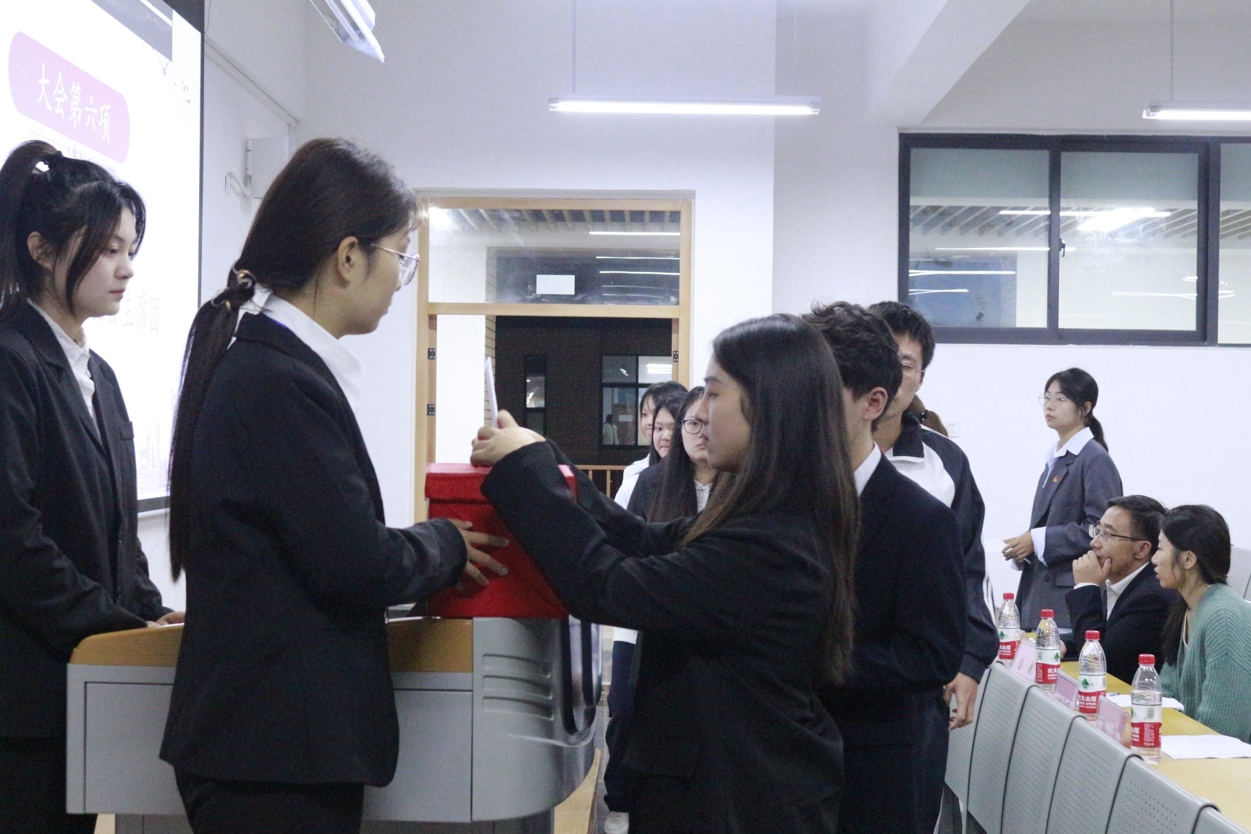 大会正式进行第一项议程。孙波老师向大家汇报总结了我院自2018年以来的共青团工作情况,并由我院第五届科技实践部负责人赵林梅代表我院第五届团总支学生会作学生工作总结报告。接下来,大会听取并审议了第二届学生代表大会暨团员大会筹备工作报告和资格审查报告。在宣读第二届学生代表大会暨团员大会选举办法后,选举正式开始。本次选举秉持公平、公正、公开的原则,以不记名的投票方式,差额选举出孙壹多、赵林梅等12名学生代表大会代表以及龙鑫雨、张宇豪等10名团员大会代表;选定赵林梅、孙壹多、成聪为第六届团总支学生会执行主席。最后,大会在全体起立齐唱校歌中结束。