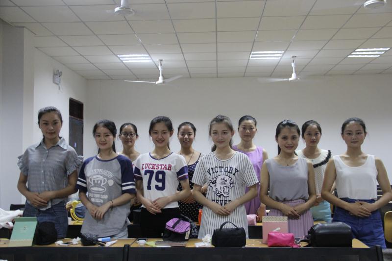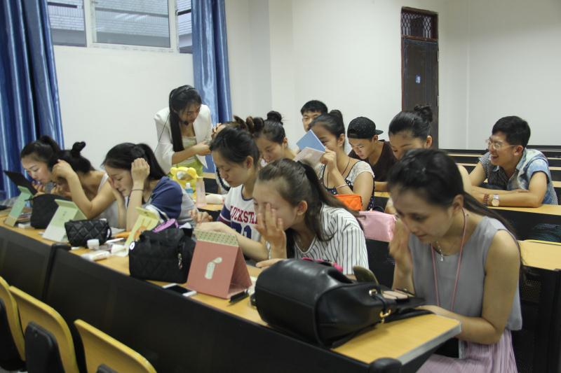 “你们平时怎样上妆?”老师在与同学们的交谈中开始了今天的主题,接下来,她拿出自己的化妆袋耐心细致地为大家展示上妆步骤、其中会遇到的小问题以及解决方法。此外,她还特别强调了眼妆和眉形的重要性,“大地色眼影是礼仪人员眼影首选”,她指出,一个精致的眼妆和好看的眉形会让你瞬间变得美丽。接下来,她为大家播放了一段韩国火热的化妆教程视频,看完视频,大家纷纷惊呼化妆的魔力。“眼睛好大好漂亮”、“平凡女变女神”一旁的男生毫不掩饰赞美之情,可见化妆的魔力。