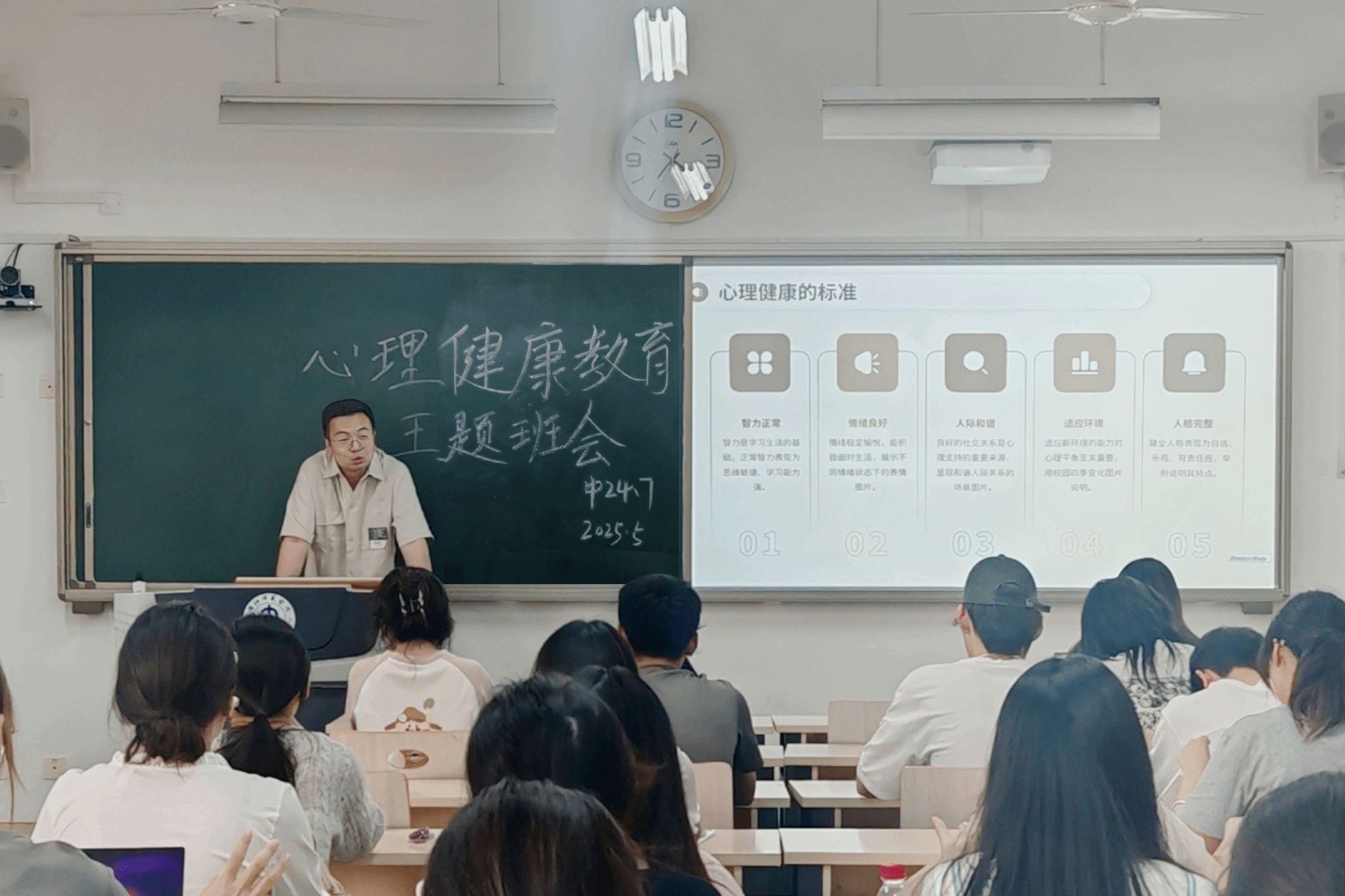 为普及心理健康知识,提升学生心理调适能力,营造积极阳光的校园氛围,我院陆续开展心理健康教育主题班会。2025年5月29日晚上7点30分,我院2024级7班在明德楼B区406教室召开了以“守护心灵绿洲,共筑阳光校园”为主题的心理健康教育班会。本次活动由班主任陈康哲老师主讲,全班同学积极参与,现场氛围温馨且热烈。