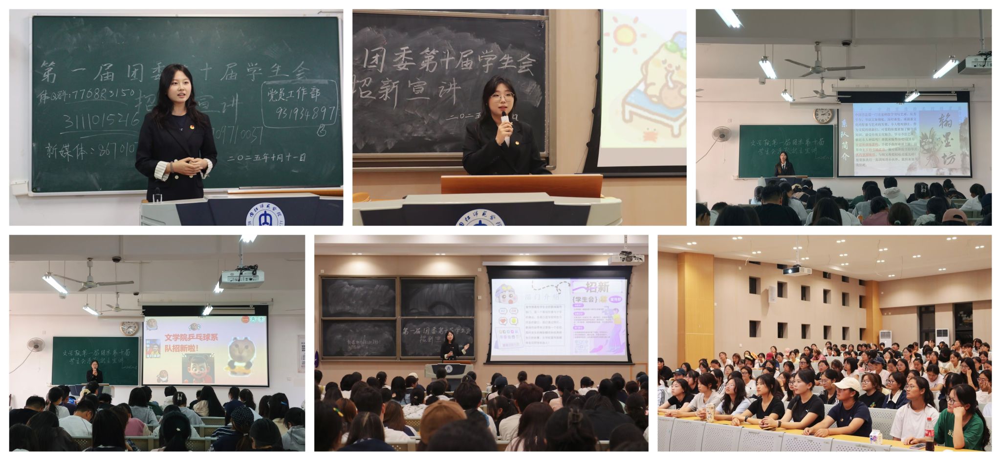 秋意渐浓,青春正好。为吸纳新鲜血液,助力学生组织与系队发展,文学院先后开展招新宣讲活动,分别于 10 月 11 日晚上七点、10 月 13 日下午 2 点 15 分,在明德楼不同教室有序进行。参与活动的人员包括我院第一届团委第二任团委副书记(学生)吴国艺,第十届学生会执行主席朱韵龙,第十届学生会主席团成员苏浩、郑林祥,文学院第十届学生会各部门负责人、各系队代表以及文学院 2025 级全体新生。