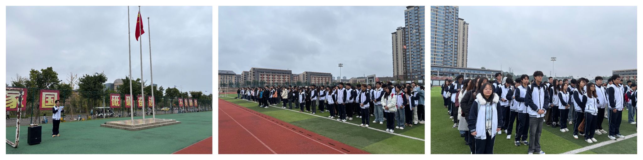 田径场上队列整齐,全体师生精神饱满、肃立静候。随着主持人清晰的指令,国旗护卫队队员手擎鲜艳的五星红旗,迈着整齐有力的步伐步入会场。激昂的国歌奏响,五星红旗冉冉升起,全体师生面向国旗肃立致礼,齐声高唱国歌。