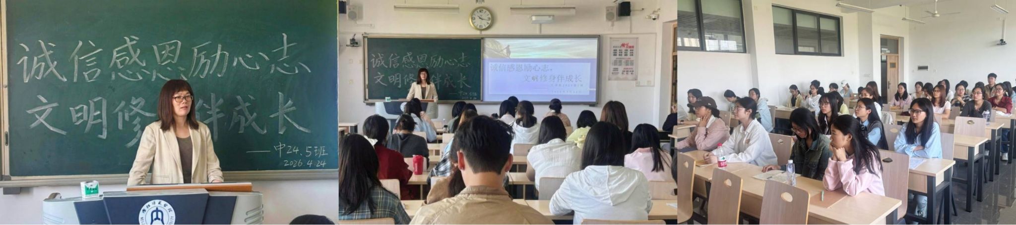 为让同学们树立诚信感恩意识,更加脚踏实地投身于学习,同时养成文明行为,4月24日上午10点,我院2024级5班于明德楼B406教室顺利开展诚信感恩励志教育与文明行为养成主题班会。本次班会由班主任敖元洪老师主讲,班级全体同学全程参与,筑牢思想道德根基,涵养优良青春风貌。