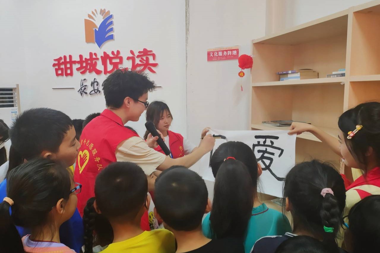 活动伊始,我院志愿者带领长安社区的小朋友们在活动区域落座,并教小朋友们做作业、折纸。在欢声笑语中,志愿者与小朋友们打成一片。随后,主持人刘星雨用爱国诗人竞答、爱国诗词问答等互动游戏引出本次活动的主题,小朋友们积极参与,竞相举手回答,气氛活跃热闹。然后,我院翰墨坊成员介绍了软笔书法、示范毛笔用法。接着,小朋友们在志愿者的指导下学习如何正确使用毛笔,并尝试用毛笔写字。新鲜的书法体验激发了小朋友们对中华优秀传统文化的热爱,使小朋友们专心投入其中。最后,本次活动在小朋友们的折纸作品、书法作品的展示中落下帷幕。