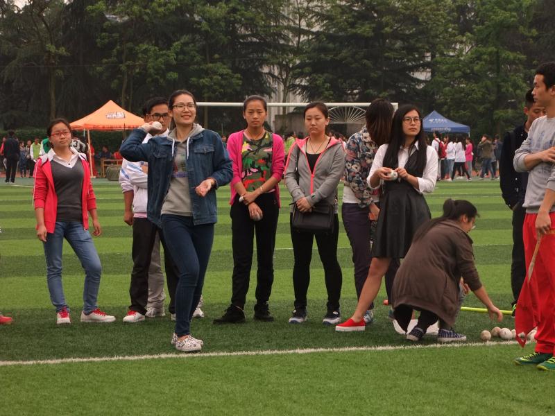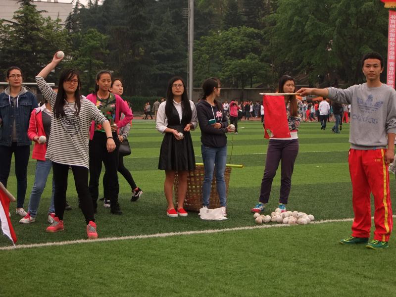 比赛正式开始,以三轮掷扔,取最高成绩排名。刚刚开始的第一轮,我院前四位同学发挥正常,分数均在中等水平。但其他学院却开创了一个满分,引得现场一片躁动。号码偏后的两位同学赵蓝军和何一笑,并没有在巨大的压力下手足无措,而是变压力为动力。只见赵蓝军同学上场,镇静地将手和垒球都滚满石灰,身体往后一扬。当听到裁判一声令下,赵蓝军瞄准标杆使出七分力,“0.28”。观众一阵欢呼,离标杆如此近的距离,排名册上如此高的成绩!