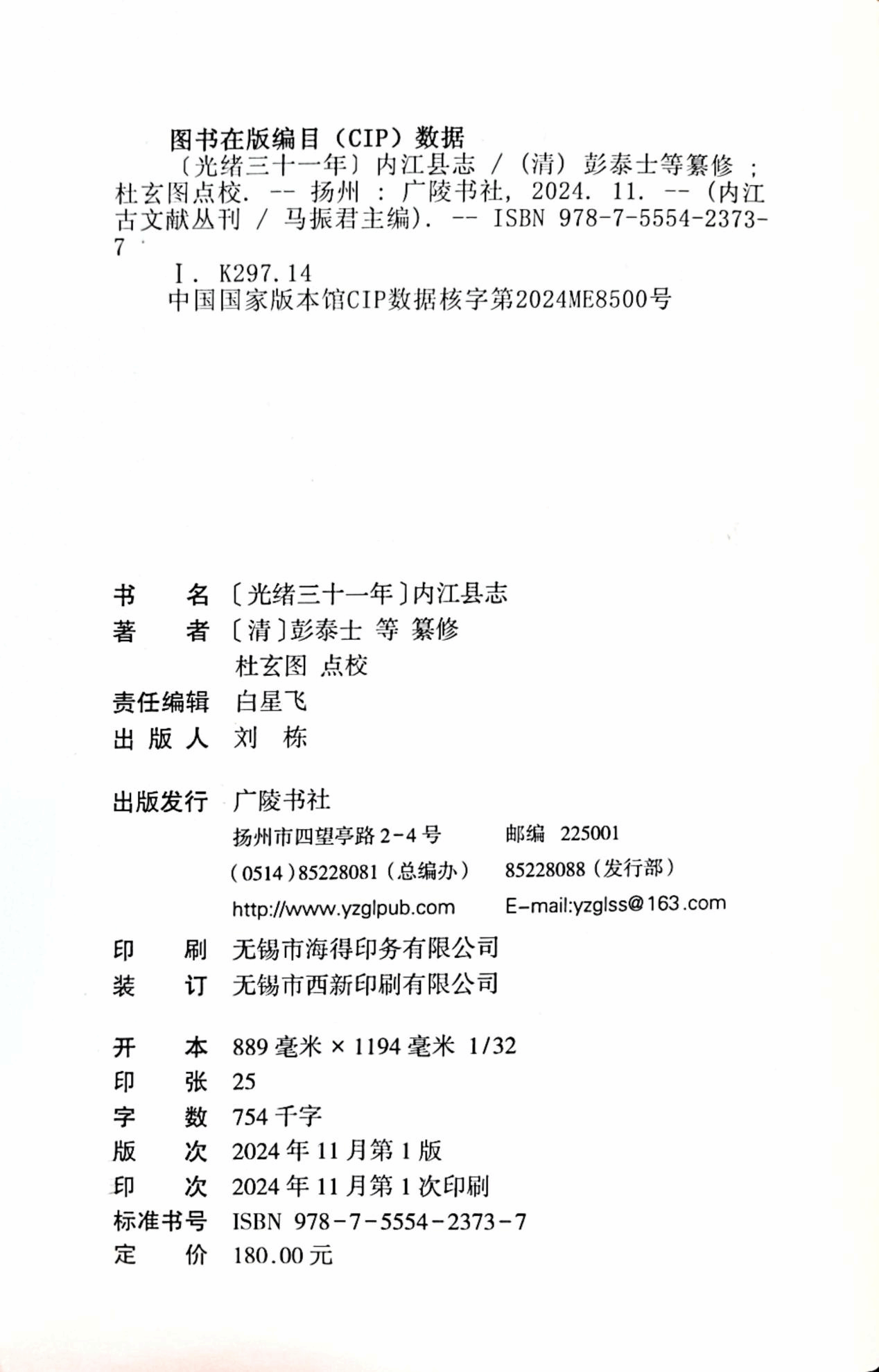 2025年12月,杜玄图教授点校的《〔光绪三十一年〕内江县志》由广陵书社正式出版。该志总字数75.4万字,简体横排,32开精装,装帧精良典雅。