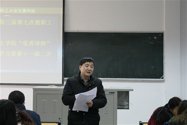 12月18日下午,我院第三届第七次教职工暨工会会员大会在中文楼303教室召开。全体教职工、工会会员参加了本次会议,会议由院长助理张文彬主持。