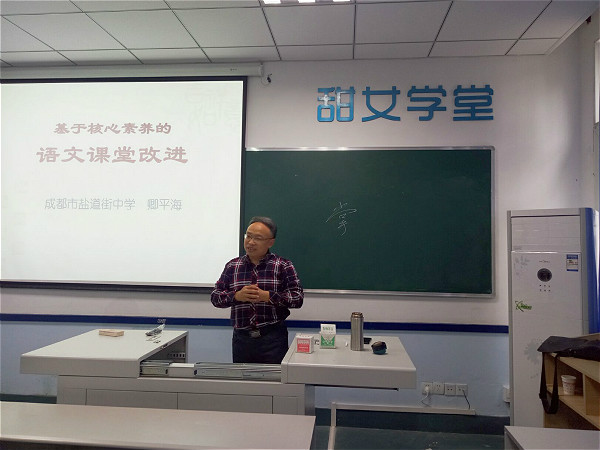 10月21日下午2点30分,来自成都市盐道街中学的特级教师卿平海在第二教学楼103教室为小学语文组学员开展了一场以“基于核心素养的语文课堂改进”为主题的讲座。此次讲座由文学院党总支副书记覃华艳主持。