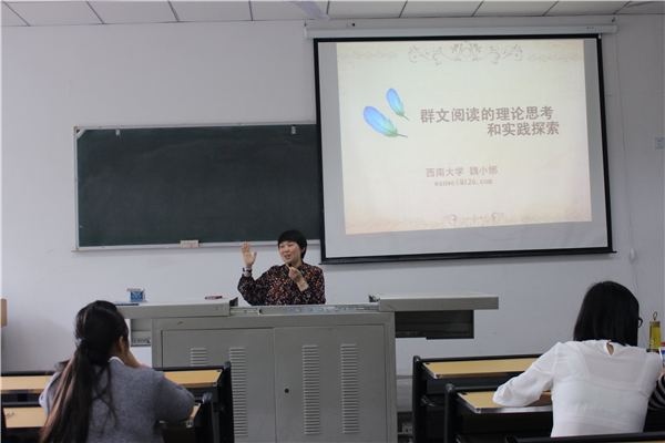5月15日上午8点30分,由西南大学文学院副教授、课程与教学论专业博士、语文教育研究室主任魏小娜老师主讲的《群文阅读的理论思考与实践探索》专题讲座在中文楼202教室顺利举行。国培(2017)初中语文组全体学员参加了本次讲座。此次讲座由我院刘川江老师主持。