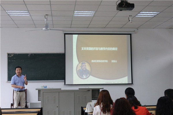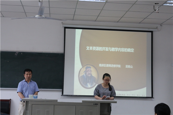 5月15日上午8点30分,来自重庆市南岸区教科院的特级教师吴维山在中文楼302带领语文小学组一起挖掘文本资源,分享教学经验。本堂培训课由贺山秀老师主持。