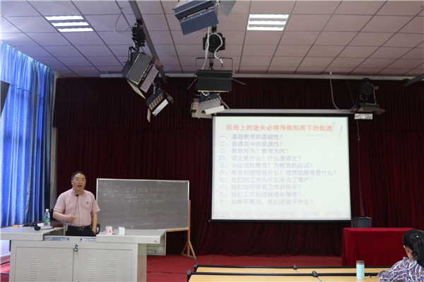 讲座伊始,段增勇老师以自己的教学经验阐述了初中教学与高中教学的相互性。他通过引用习总书记的讲话,深刻探讨了语文教育的基础性和先导性。他表示,在初中教学过程中,大家可以对小学学习过的文章有更深入的理解,以达到温故知新的目的。段增勇老师一句关于“如果不教书我还能做什么?作为一个教师和非教师的差异是什么?”的话引起了在座老师的深思。