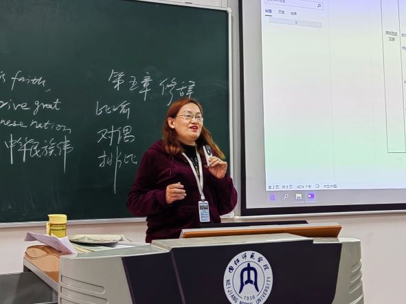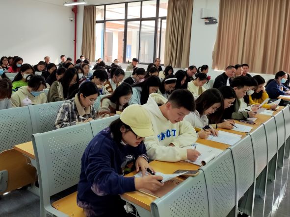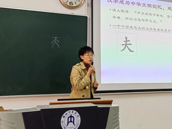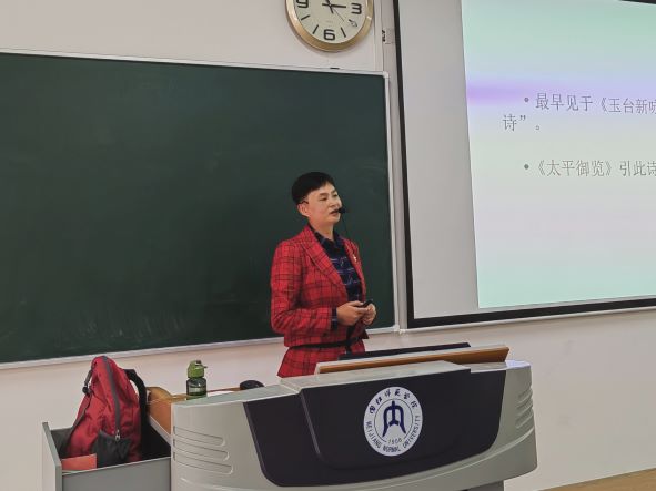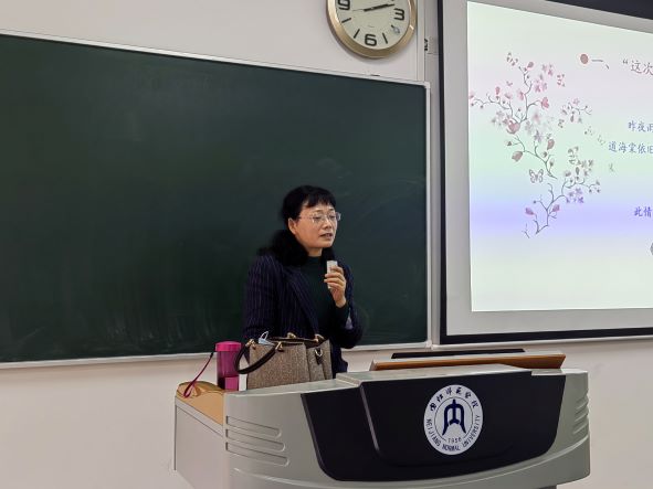 比赛现场,李厚琼教授以“李清照《声声慢·寻寻觅觅》的情感内涵”为题,带领师生们一起体味女词人在困境中不甘沉沦、自强不息的精神,希望学生通过词作,懂得珍惜眼前的美好生活,并始终保持积极乐观向上的生活态度;冯利华副教授以一首汉代乐府诗《上山采蘼芜》,引导学生以小组讨论的方式分析诗作的主题,由“蘼芜”治疗女子不孕,反映出女性在当时所处的不平等的社会地位,由此使学生懂得对待传统文化应取其精华、去其糟粕;肖青青副教授以“二十大”报告中的修辞为主题,与学生一同研讨了“排比”“对偶”两种修辞手法的特点和作用,共同体会党的工作报告中语言的凝练与优美;王昕博士以古代汉语中汉字的表意性为题,通过释读汉字,阐述了“一个个历史悠久的汉字本身就是中华文化的活化石”的思想,并揭示了汉字对于民族团结和国家统一的重要作用。
