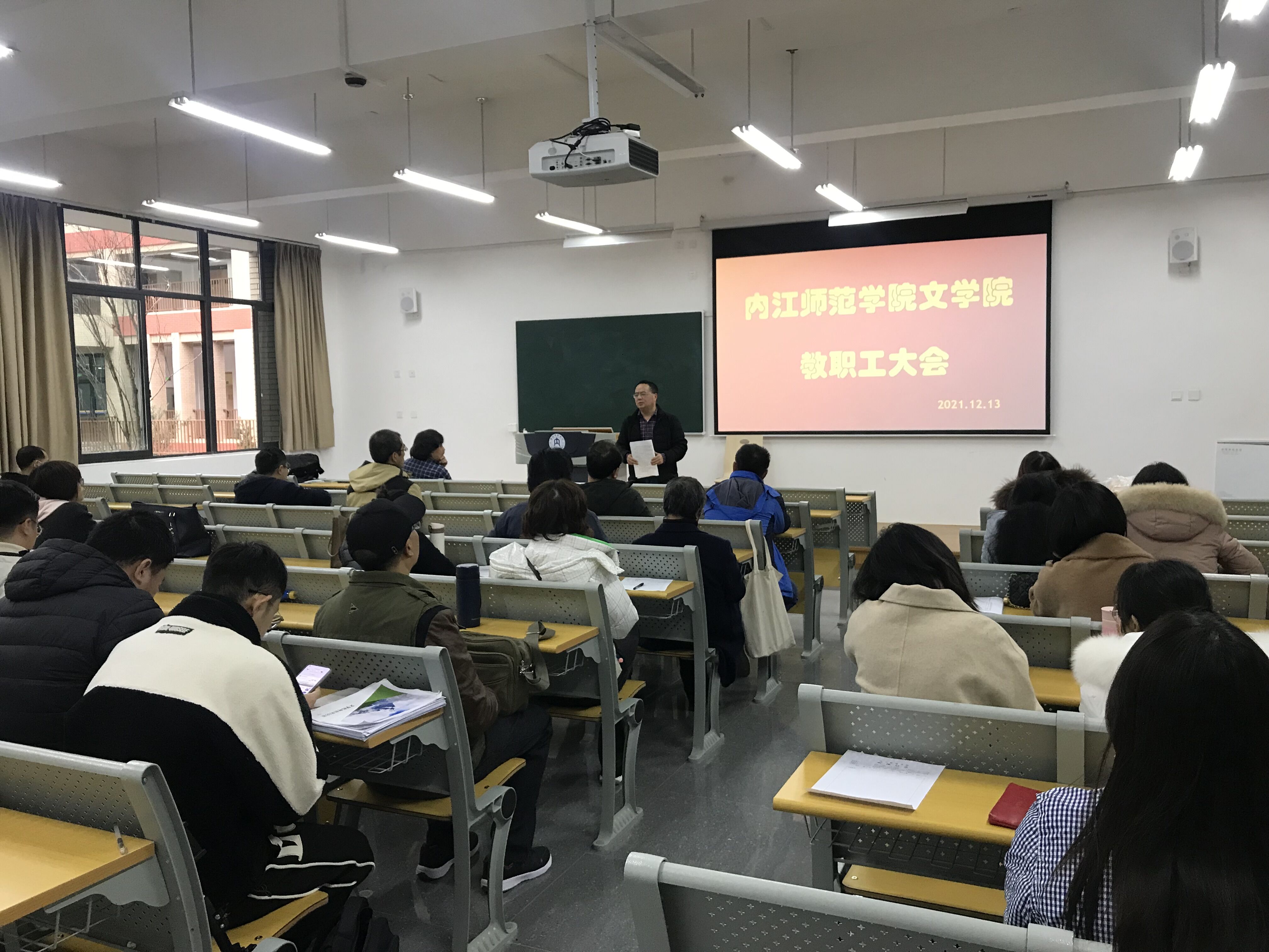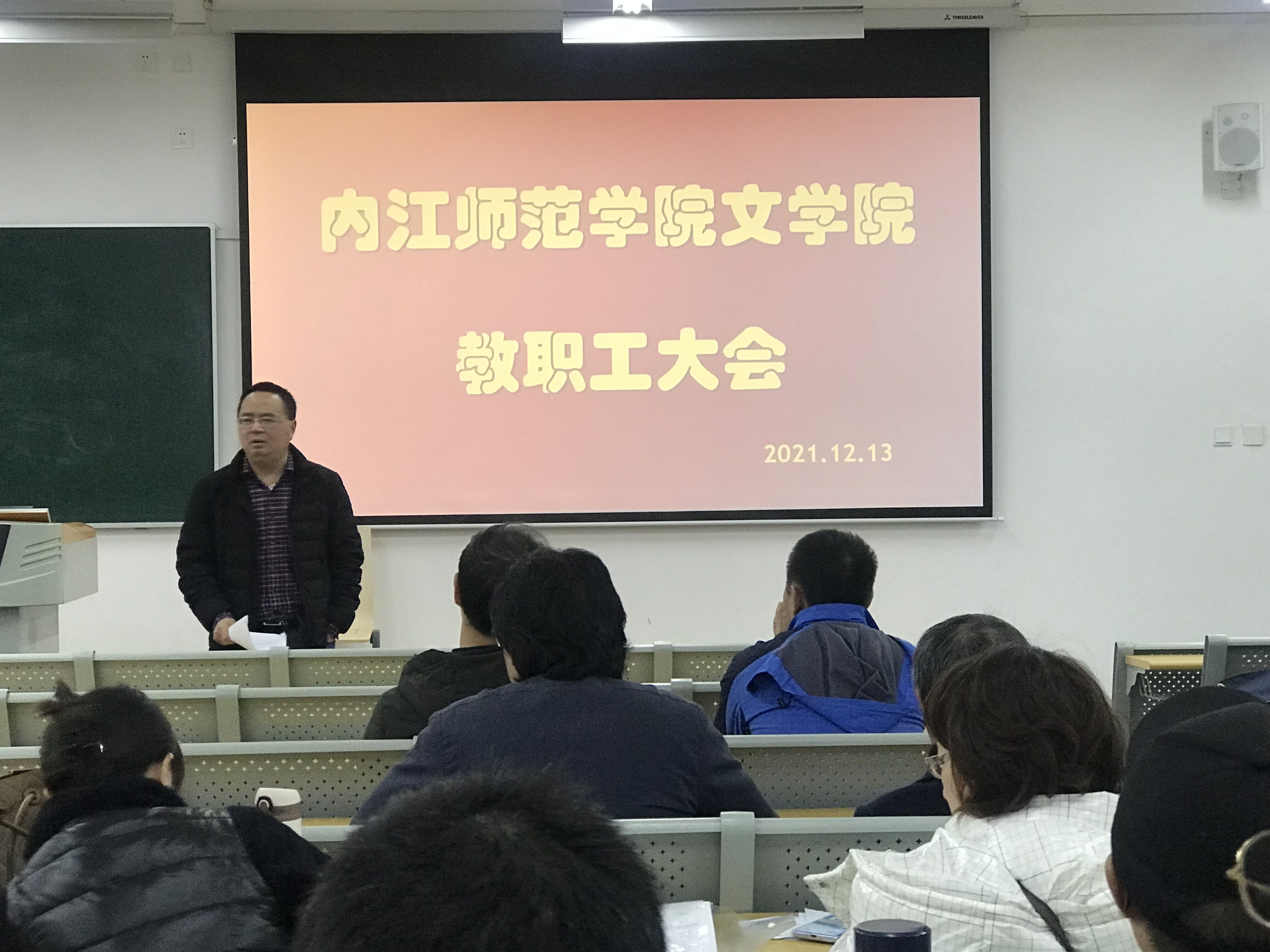 12月13日下午3点,文学院在明德楼B102召开2021年度学院教职工大会,学院全体教职工出席,大会由党总支副书记(主持工作)周艺主持。