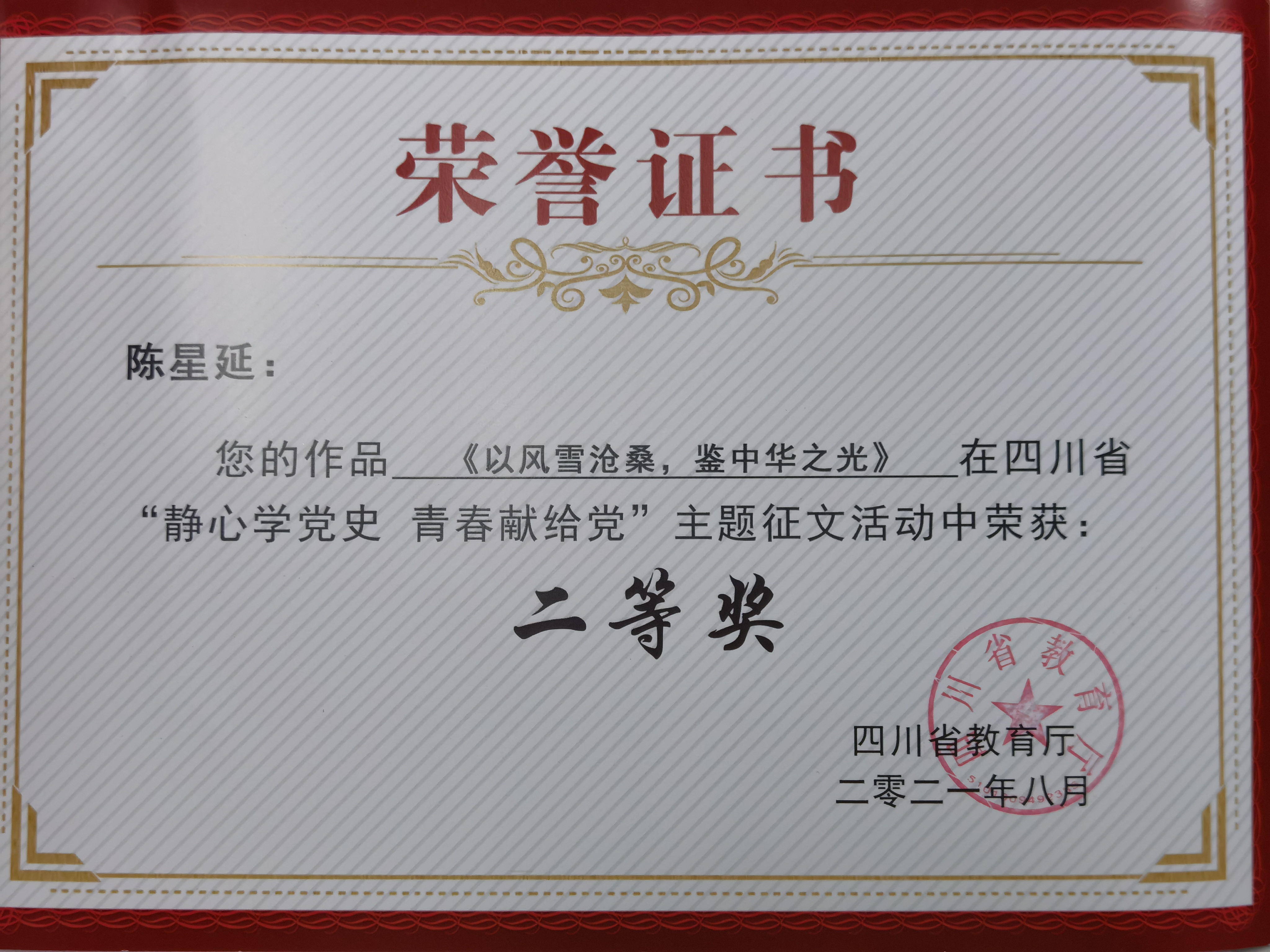 本次大赛旨在引导新时代的青年们坚定理想信念,激发爱党爱国的巨大热情,增强道路自信、理论自信、制度自信、文化自信。陈星延同学凭借《以风雪沧桑,鉴中华之光》突出重围,荣获四川省二等奖。她在文中巧用典故和诗词,表达了她对中国共产党员艰苦奋斗历程的由衷钦佩。她的文章不仅展现了我院学子扎实的文学功底,还彰显了我院学子坚定跟党走的决心。