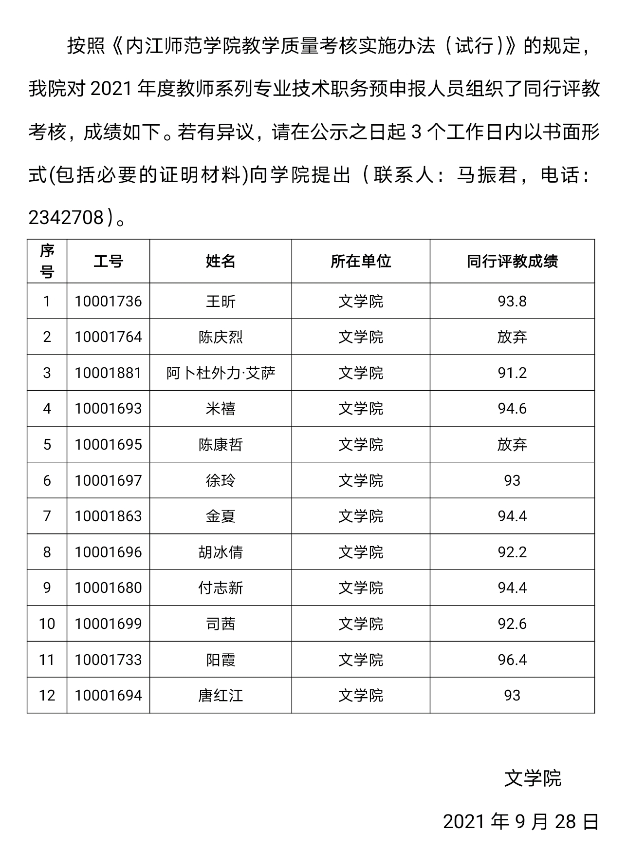 文学院关于2021年度教师系列专业技术职务预申报人员同行评教成绩的公示