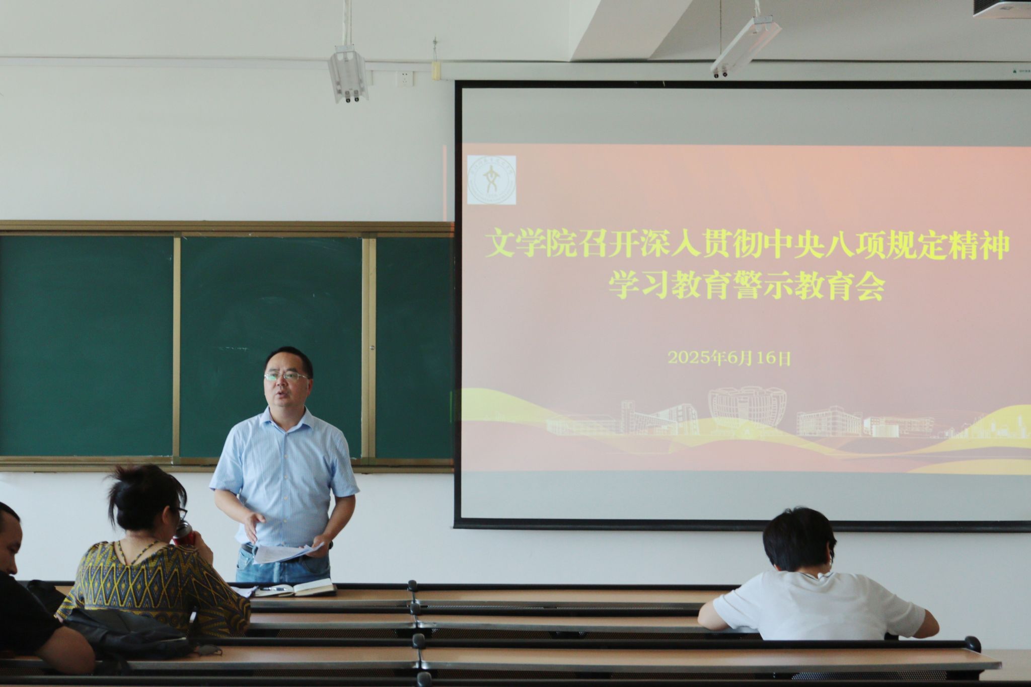 2025年6月16日下午,文学院在弘文楼502教室召开深入贯彻中央八项规定精神学习教育警示教育会。会议由文学院党委书记周艺主持,全体教职工参加了此次会议。