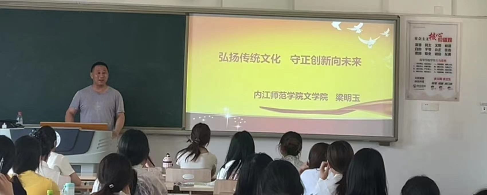 梁明玉还结合具体案例,深入浅出地讲解了传统文化中的“仁义礼智信”“和合共生”等核心理念,并联系当下社会实际,分析了传统文化在培育社会主义核心价值观、增强文化自信等方面的重要作用。他还特别提醒同学们,学习传统文化不能停留在表面,要深入理解其精神内涵,做到知行合一。
