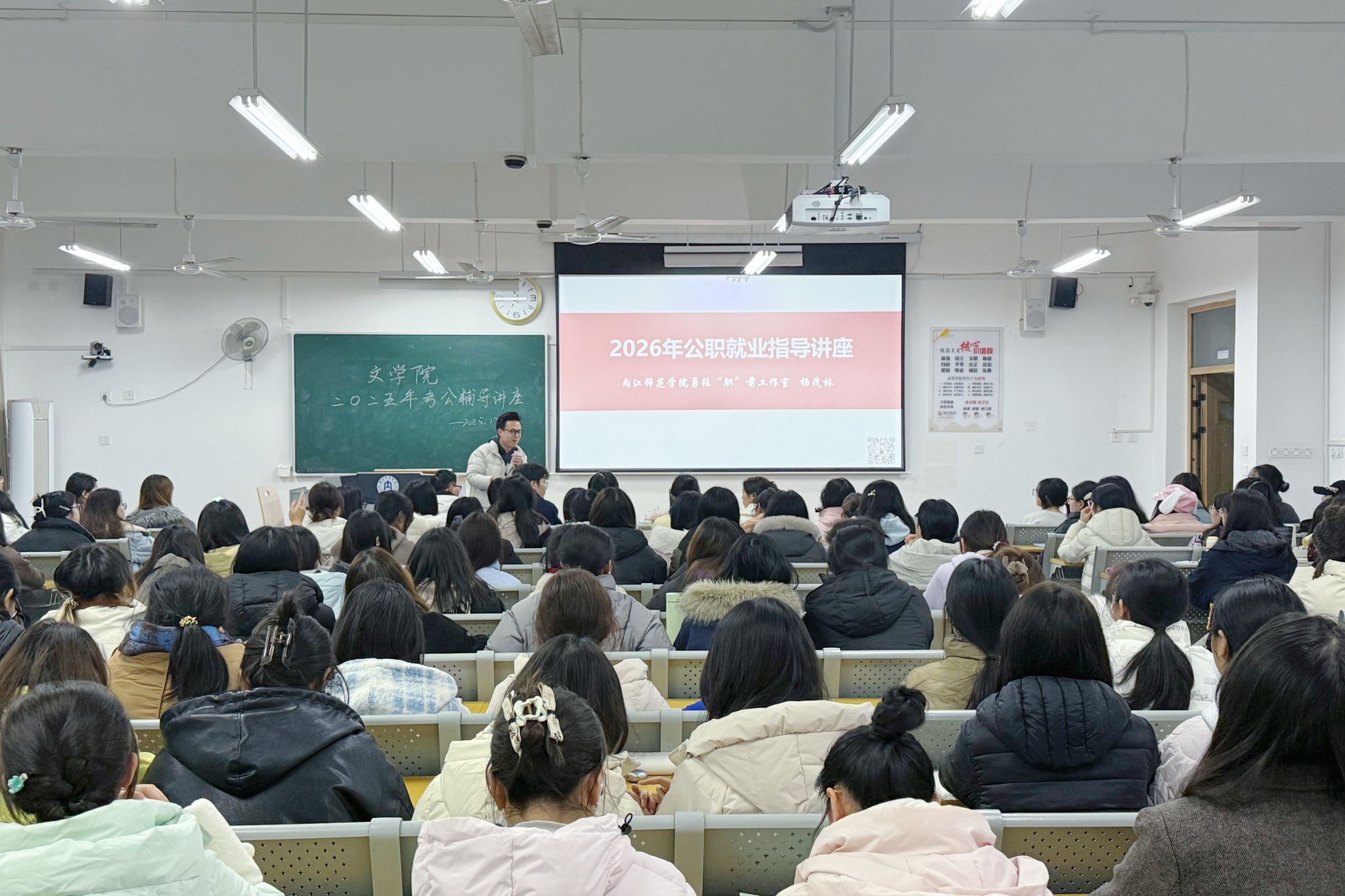 为切实回应文学院学子公职就业刚需,破解备考迷茫与报考困惑,12 月 17 日晚 7 点,文学院特邀学校马克思主义学院教师、勇往 “职” 前工作室杨茂林老师,开展 2026 年公职就业指导专题讲座。讲座紧扣文学院学子专业特点与实际需求,聚焦报考实操技巧、备考路径规划等核心问题,为意向投身公职的同学送上 “精准导航”。