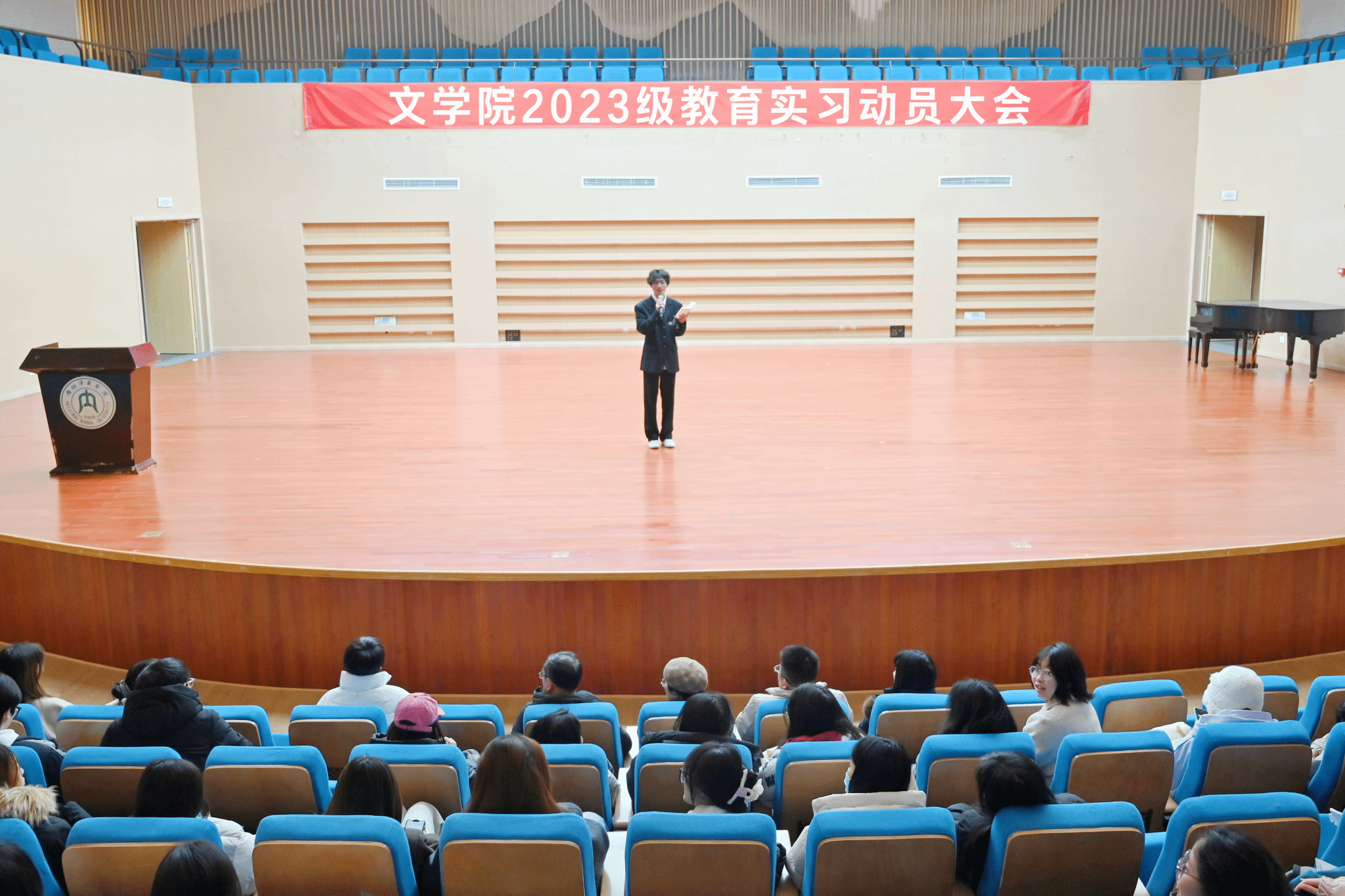 为推进2023级汉语言文学专业教育实习各项工作有序开展,2025年12月29日,文学院在学校会议中心演奏厅召开了教育实习动员大会。文学院党委书记周艺,副院长(主持工作)于军民,党委副书记、纪委书记周琼,院长助理王昕以及2023级班主任老师、全体同学参加了动员大会。