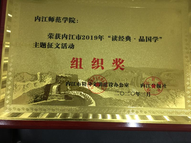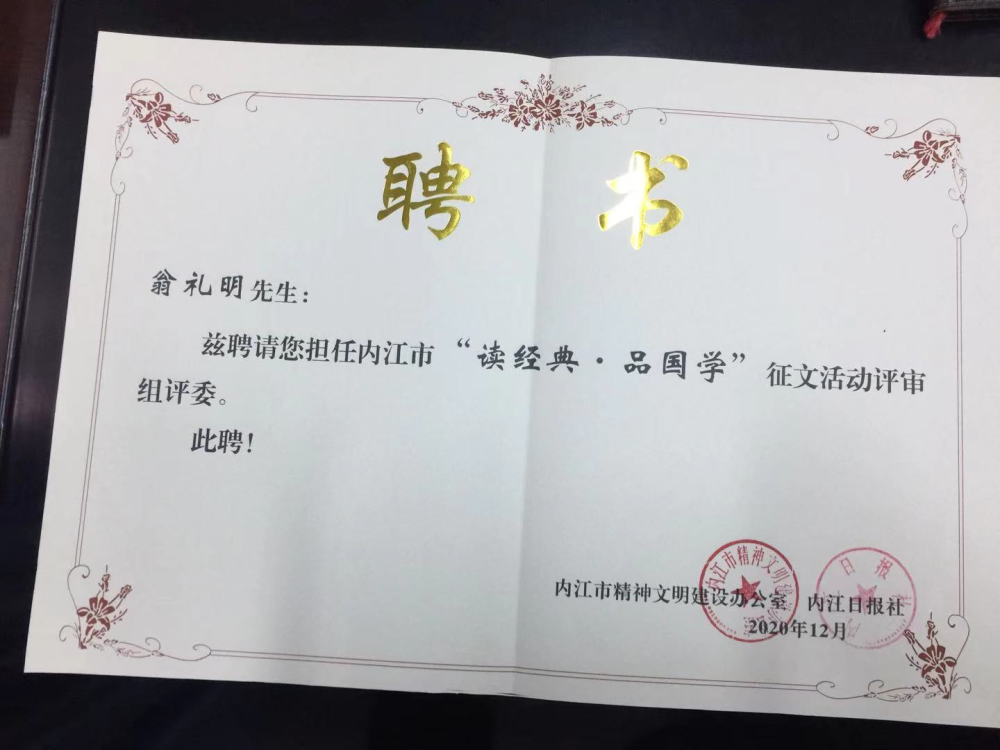 3月25日,内江市精神文明建设办公室、内江日报社开展的2019年度“读经典·品国学——我们的节日”征文活动评选圆满结束,我校荣获组织奖,翁礼明教授受邀担任本次征文活动评委。近日,我院获悉,翁教授再次被聘为内江市“读经典·品国学”征文活动评审组评委成员。