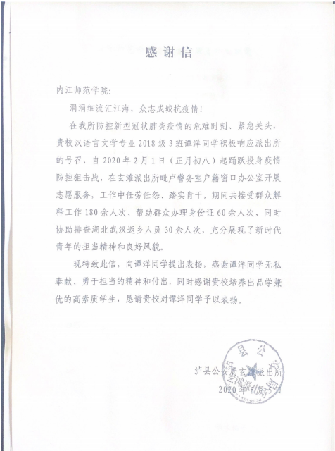 近日,泸县公安局玄滩派出所对我院2018级3班的谭洋同学在疫情防控关键时期,积极响应派出所号召,自2020年2月1日起投身疫情防控狙击战中所表现出的积极进步的思想品质和乐于奉献的高尚情操予以了高度肯定,并就学院给予谭洋的精心栽培表示了郑重感谢。