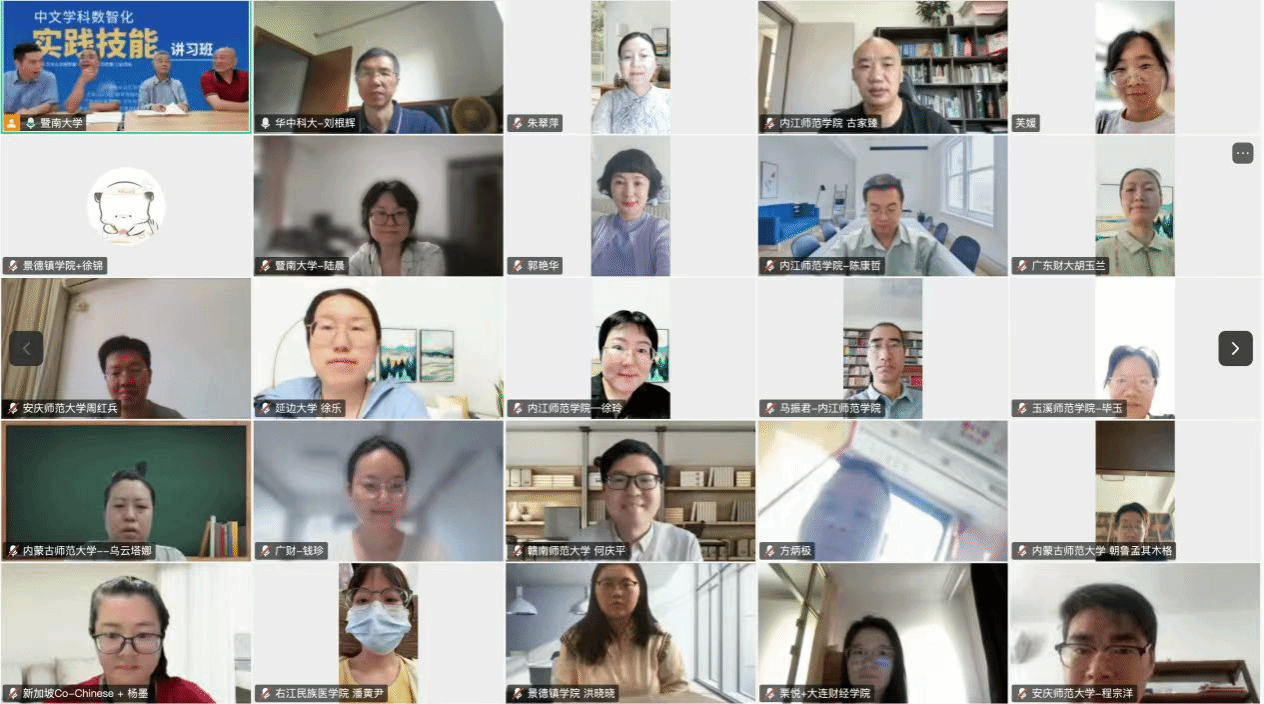 2025年8月27日,由暨南大学文学院、古联(北京)数字传媒科技有限公司、广东省岭南数字人文实验教学示范中心、暨南大学-科大讯飞方言语音科技校企联合实验室联合主办的“中文学科数智化实践技能讲习班”在线上开课。共有来自数字人文专业发展联盟与岭南数字人文联盟60多所高校的200多位教师参与讲习班的学习,我院王昕、马振君、陈康哲等二十余位老师以及2024级数字人文班的部分同学参加了线上学习。