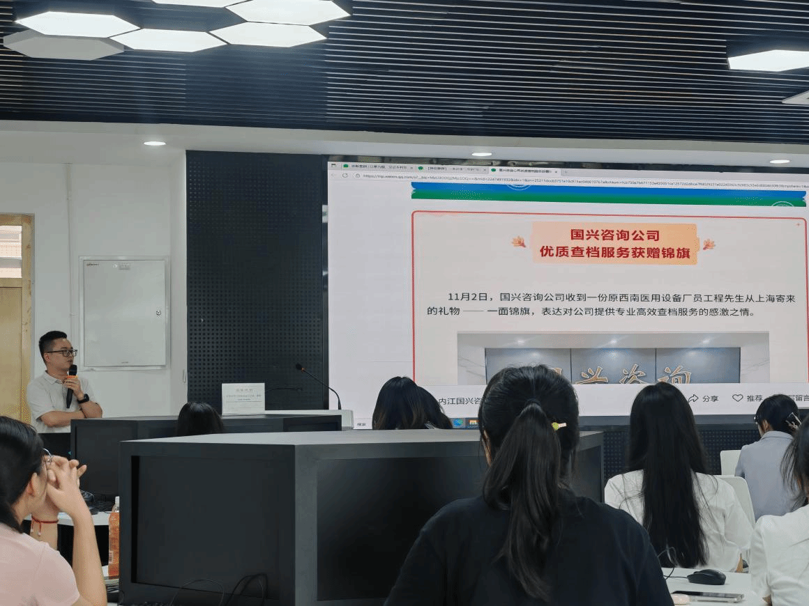 在案例分享环节,陈勇老师通过大屏幕展示了“国兴咨询公司优质查档服务获赠锦旗”的典型案例。该案例记载了2023年11月2日,国兴咨询公司因提供专业高效的查档服务,帮助原西南医用设备厂员工程先生解决了实际问题,从而收到其从上海寄来锦旗表达感激之情的具体事迹。专家借此案例强调,档案工作绝非简单的收集与保管,其核心价值在于利用与服务。“从接收一面锦旗,到接收一份责任”,档案工作要真正体现“记录一生、服务一生”的重要作用,让故纸堆中的文字焕发出新的生命力。讲座尾声的互动环节气氛热烈,同学们踊跃提问。针对“市档案馆工作对数字人文专业大学生有何要求”以及“行业前景如何”等问题,专家进行了细致解答。他勉励同学们扎实掌握档案管理与数字技术交叉领域的核心能力,建议大学阶段通过实习积累实操经验,成为能推动传统档案工作数字化转型的赋能者。