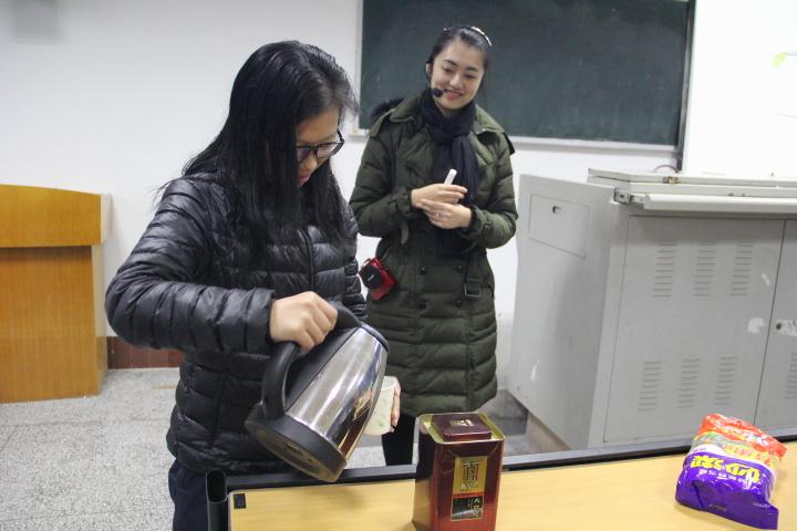 随后,傅老师分别从有人操作电梯和无人操作电梯两种情况为例,为同学们详细讲解了电梯礼仪。最后,傅老师根据过去自己的空姐经历为同学们讲述了茶水服务礼仪,并且进行了现场演示与指导,讲解了顺序、手的位置等基本程序规范。