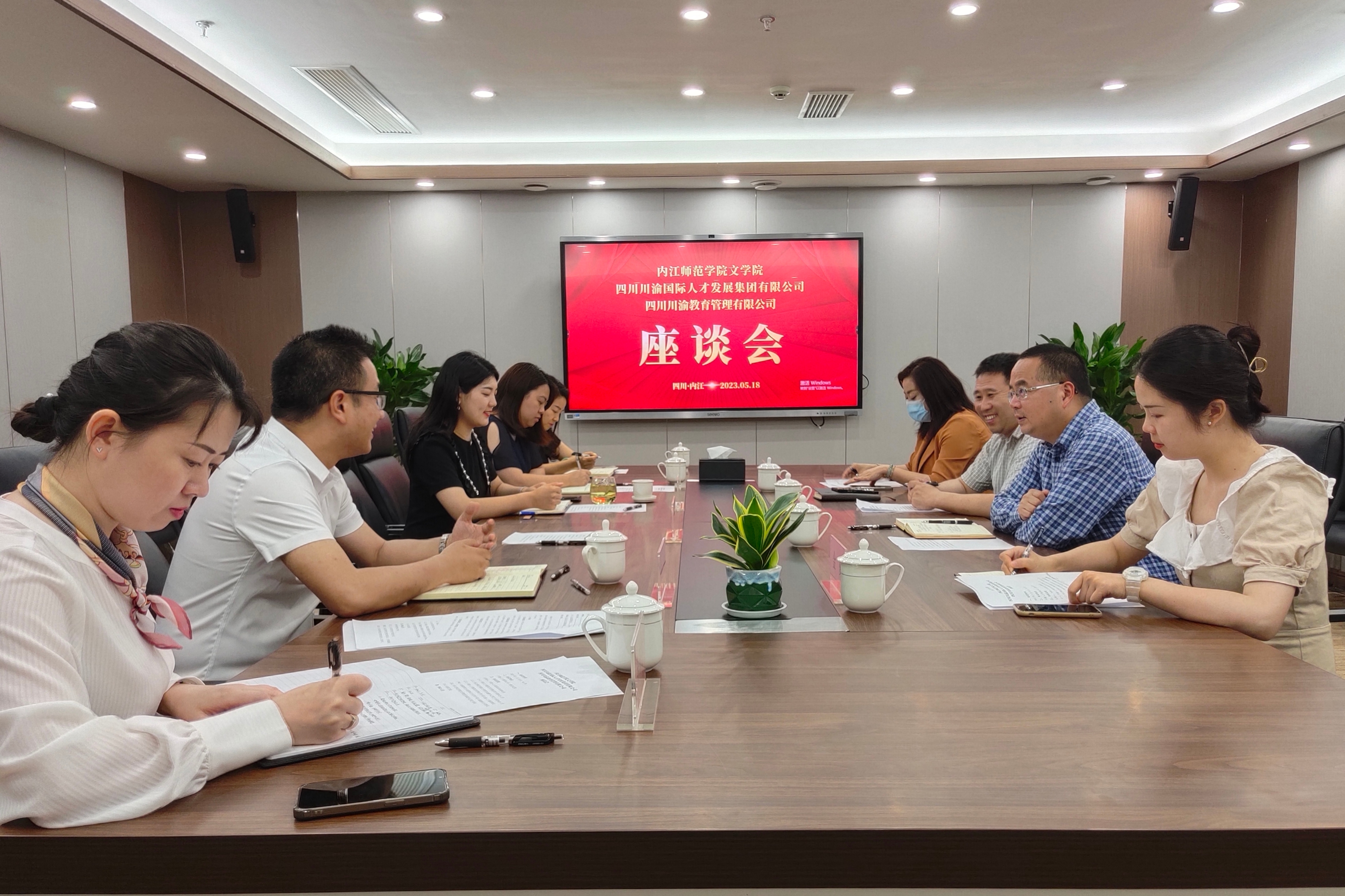5月18日下午4点30分,我院于川渝人才集团公司二楼会议室开展“访企拓岗”座谈会。四川川渝国际人才发展集团有限公司副总经理、四川川渝教育管理有限公司董事长许亚琴,四川川渝国际人才发展集团有限公司产业开发服务部副部长王琳玲,综合办公室行政岗陈亲宇,四川川渝教育管理有限公司副总经理冉肸,继教管理部副部长黄丽及我院党委书记(主持工作)周艺,党委副书记、副院长(主持工作)梁明玉,党委副书记、纪委书记刘正丽,学工办副主任金夏老师出席此次座谈会。在此次会面交谈中,我院与两所公司围绕人才培养、拓宽就业岗位、校企深度合作等方面进行了深入的讨论,希望通过此次交流座谈进一步加强校企间的沟通合作。