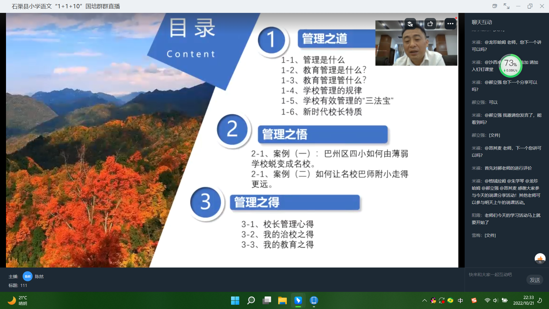 为深入落实国培计划,切实提高石渠县国培教师的管理能力。文学院特邀巴中师范附属实验小学党支部书记、校长陈然于2022年6月17日晚在钉钉平台开展了题为“探索名校管理规律,争做新时代名校长”的专题讲座。陈然校长从学校管理、教学工作、教师个人成长三个层面进行讲解,将对我校教师教育管理能力的提高与发展产生深远影响。
