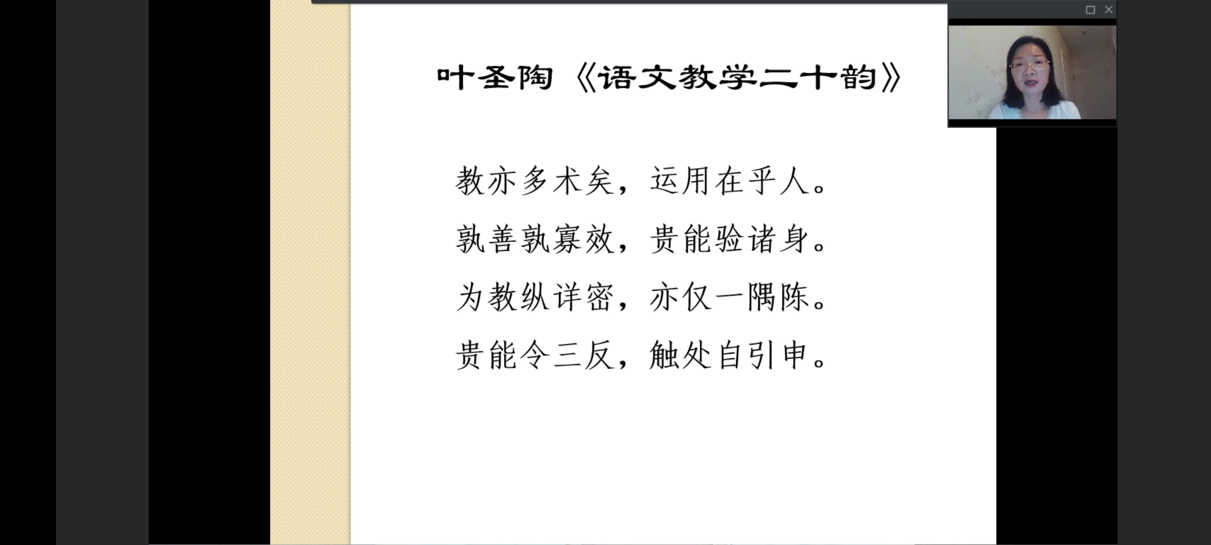 讲座伊始,温春梅老师以诗意的语言导入内容,她谈到29年的小学语文教师经历让她对小学语文阅读教学有了较为深刻地理解与感。在正式进入阅读教学的讲解之前,温春梅老师提出三个问题:什么是语文、为什么学语文、怎样学好语文,并用叶圣陶先生的观点和《义务教育语文课程标准》的内容对三个问题分别作了简明的解答。